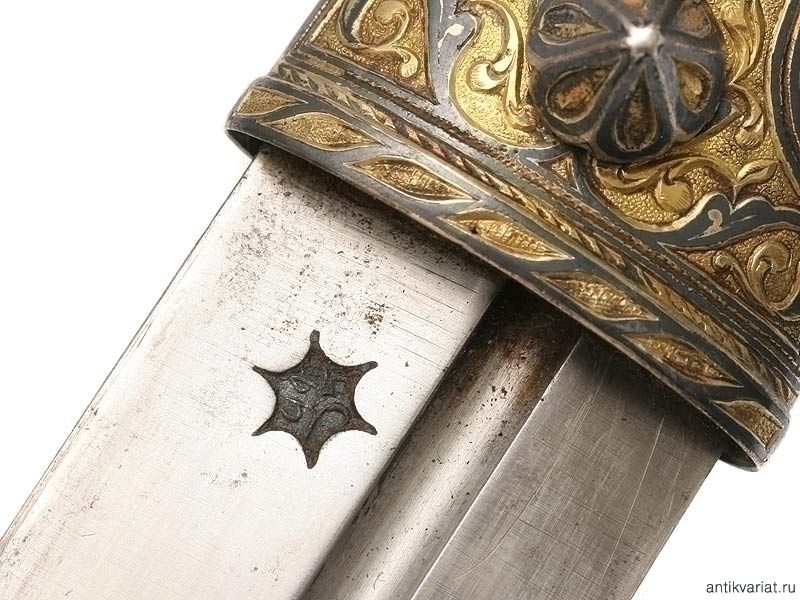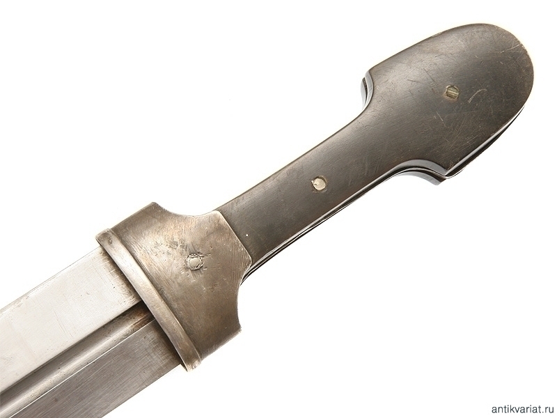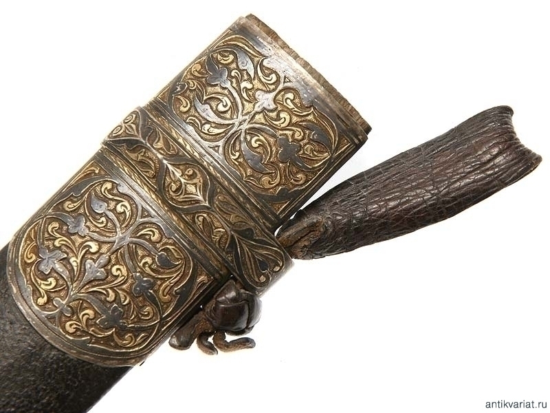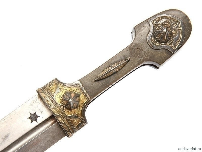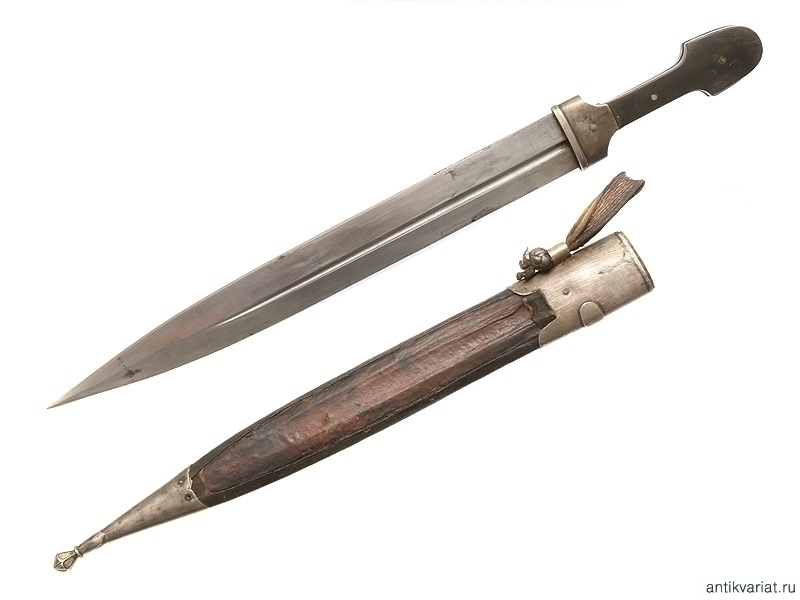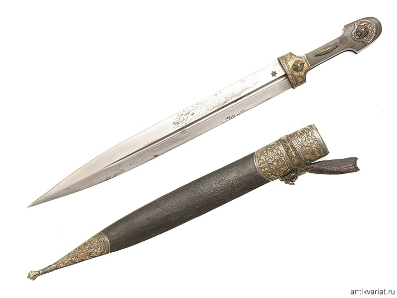 Кавказский кинжал второй половины XIX - начала ХХ века. Клинок высококачественной работы, с одним узким долом и клеймом мастера у основания. Рукоять роговая с серебряными заклепками, ножны деревянные, обтянуты черной кожей. Устье ножен и наконечник богато декорированы чеканным серебром с черневым орнаментом, сохранилось оригинальное золочение.
