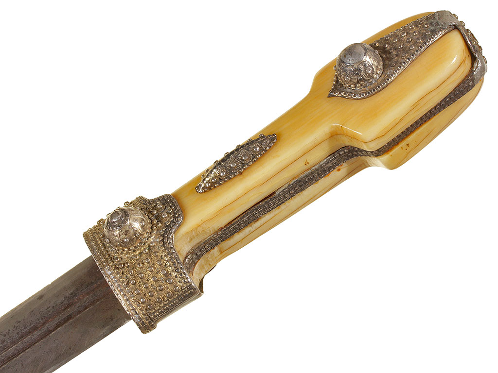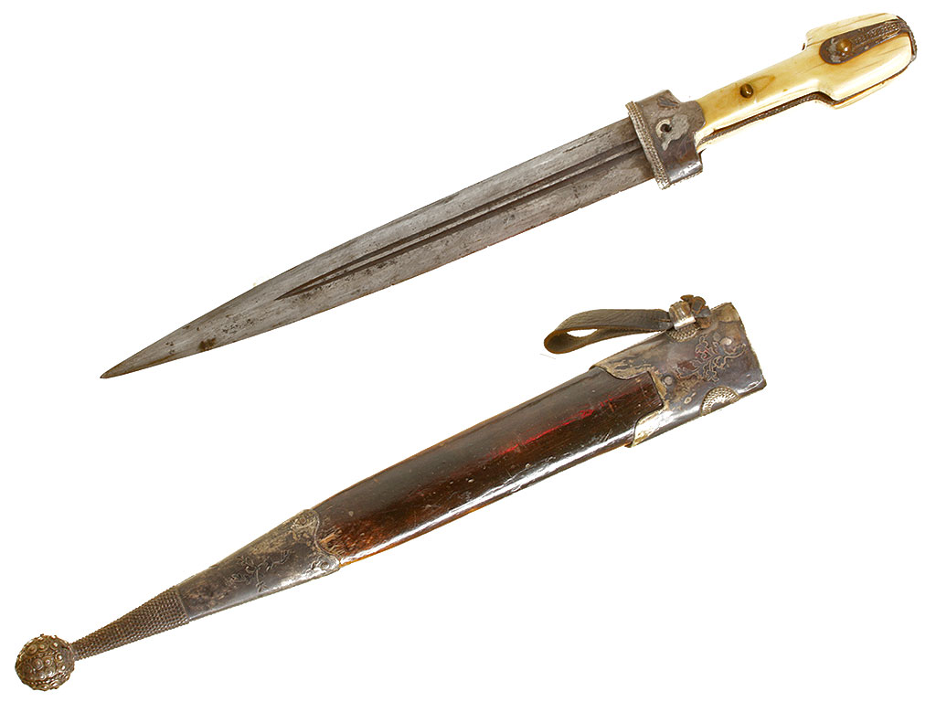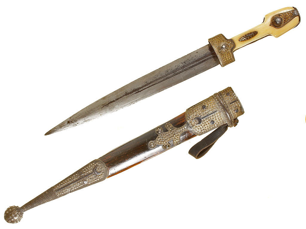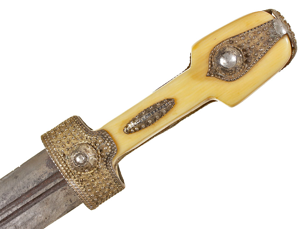 Традиционный кавказский кинжал, изготовленный грузинскими мастерами в начале ХХ века. Клинок с двумя узкими долами, без клейм, ничем не украшен. Рукоять из слоновой кости, с серебряными обоймицами и сферическими заклепками, украшена зернью, сканью и позолотой в традиционном для грузинских ювелиров стиле. Ножны в основе деревянные, выкрашенные в черный цвет, с серебряными золочеными устьем и наконечником, украшенными зернью, сканью и черневыми орнаментальными элементами.