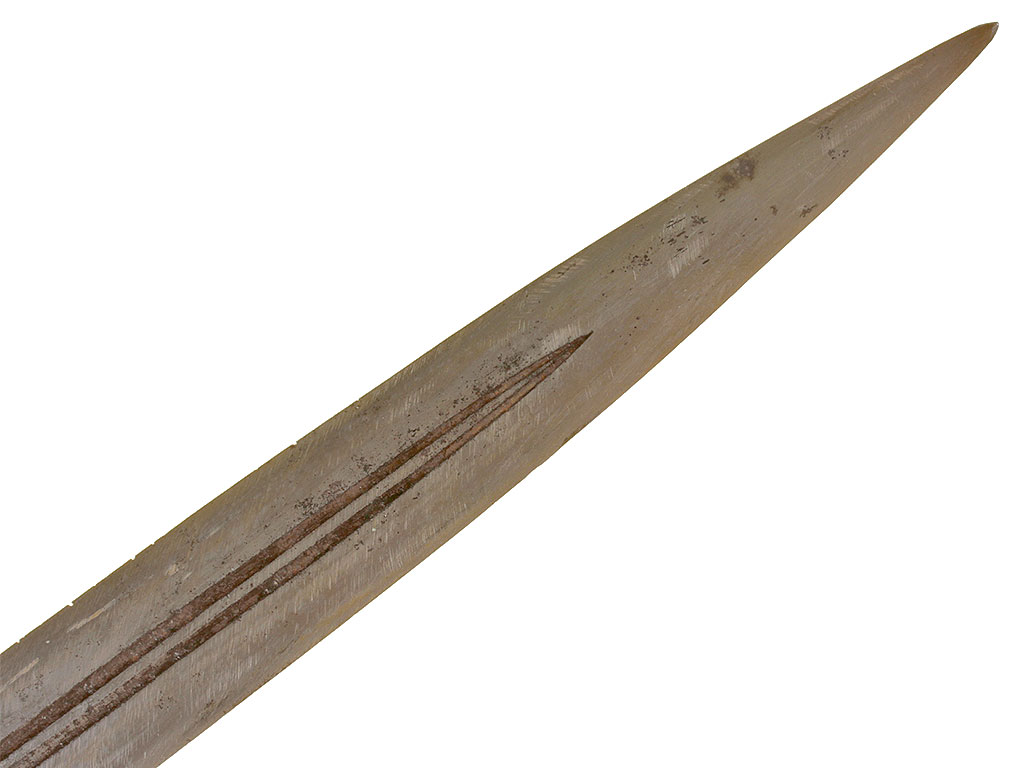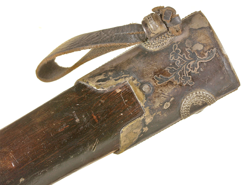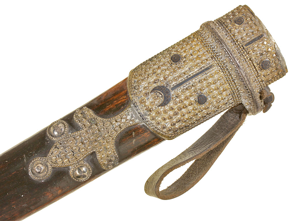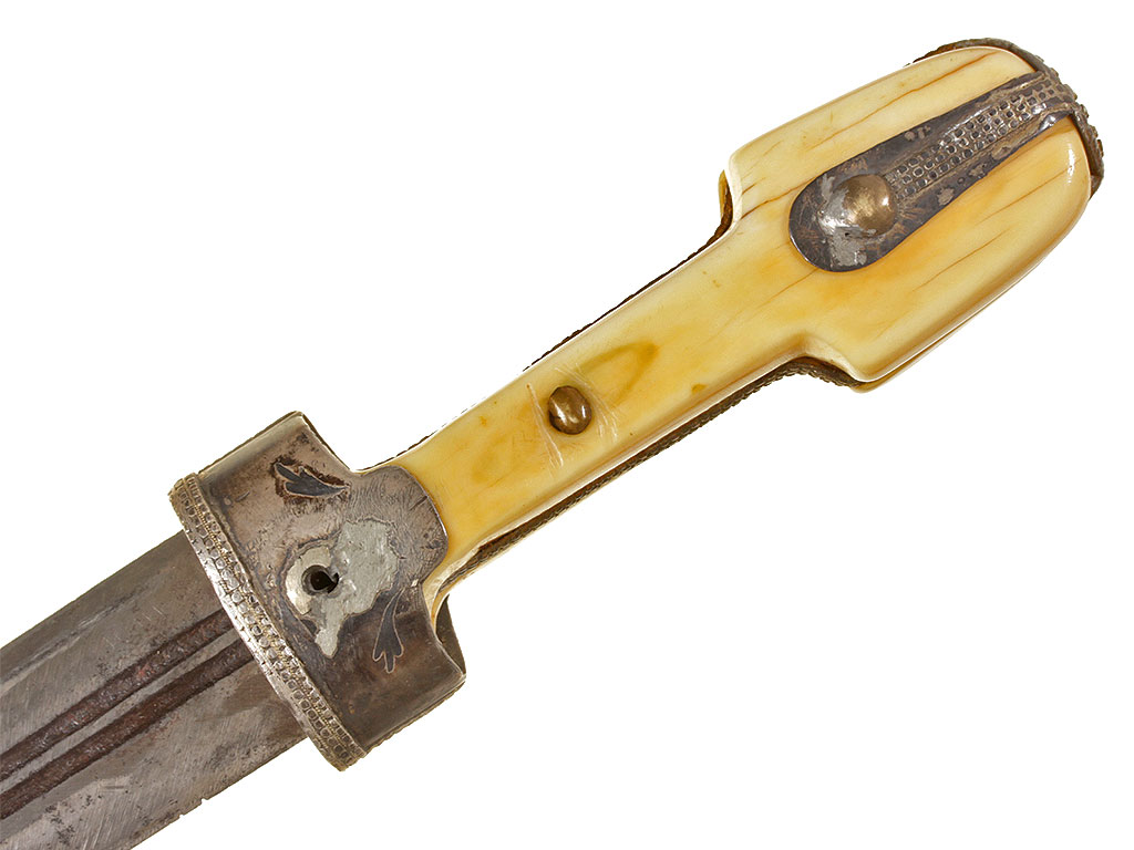 Традиционный кавказский кинжал, изготовленный грузинскими мастерами в начале ХХ века. Клинок с двумя узкими долами, без клейм, ничем не украшен. Рукоять из слоновой кости, с серебряными обоймицами и сферическими заклепками, украшена зернью, сканью и позолотой в традиционном для грузинских ювелиров стиле. Ножны в основе деревянные, выкрашенные в черный цвет, с серебряными золочеными устьем и наконечником, украшенными зернью, сканью и черневыми орнаментальными элементами.