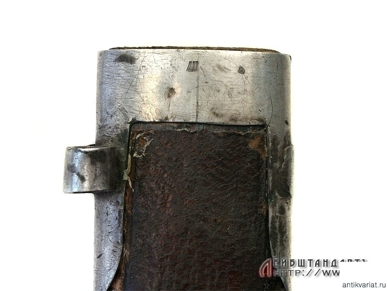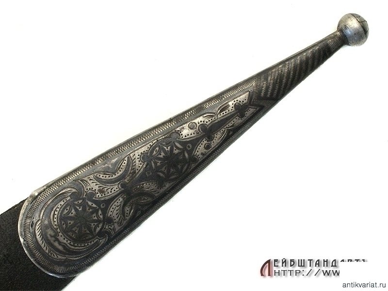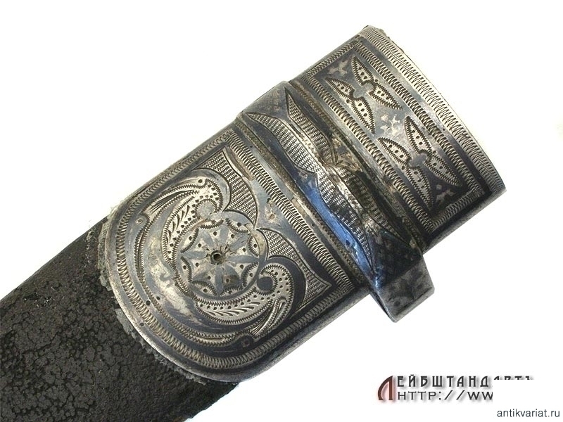 Ножны деревянные, обтянутые кожей, металлический прибор состоит из устья и наконечника. Все элементы серебряные, украшены гравировкой и чернью, серебро не апробировано.
