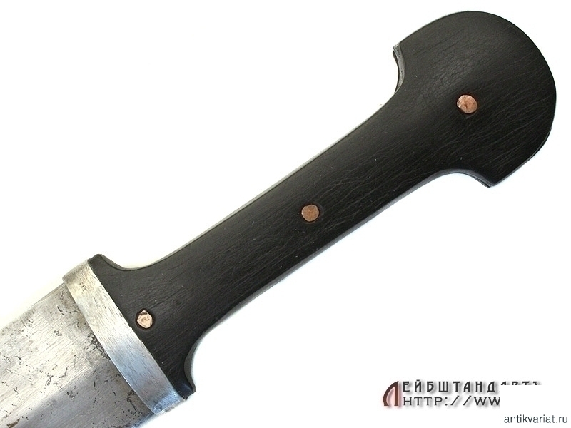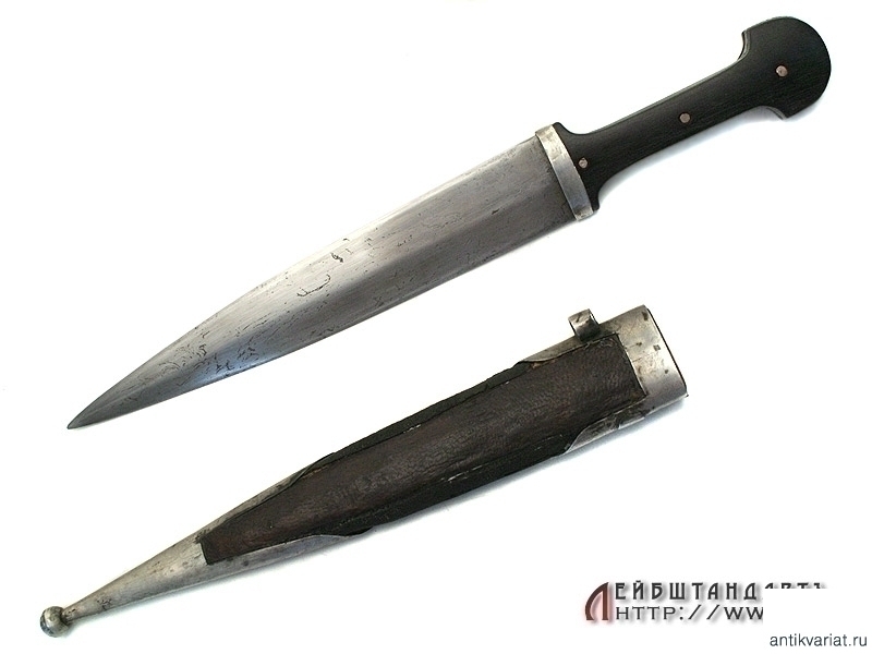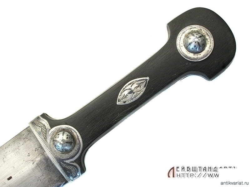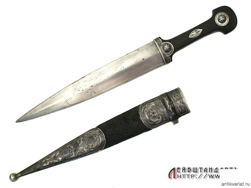Кинжал детский кавказского типа в очень хорошем состоянии. Общая длина кинжала - 34,2 см, длина без ножен - 29,3 см, длина клинка - 20 см. Клинок классический кинжального типа, с ребром. Клинок без клейм. Рукоять образована двумя роговыми щечками, снабженными серебряными устьем и двумя фигурными заклепками. Все элементы украшены гравировкой и чернью.
