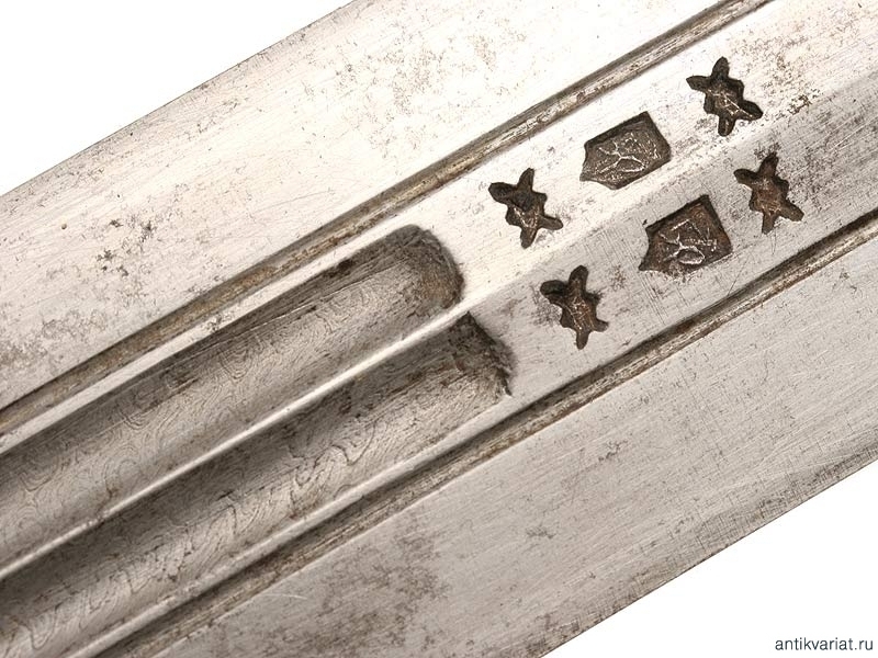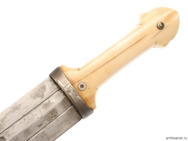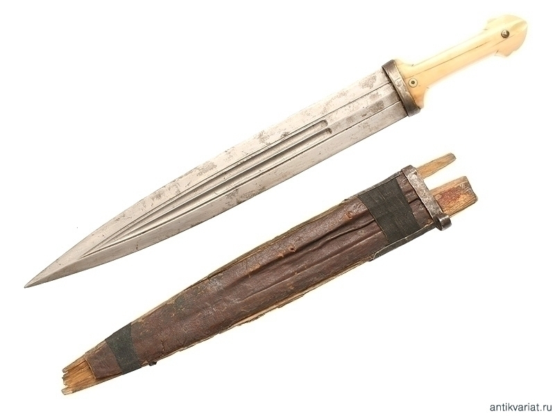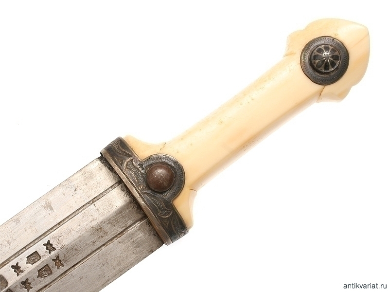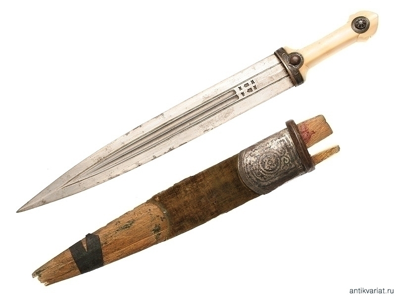Кавказский кинжал второй половины XIX века. Клинок с двумя узкими долами, в которых виден высококачественный дамасский узор структуры стали, с двумя фигурными миниатюрными клеймами. Рукоять из слоновой кости, с серебряными заклепками. Ножны с серебряным, украшенным черневым орнаментом устьем, требуют реставрации.