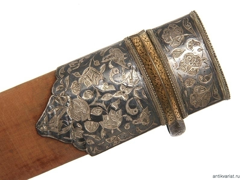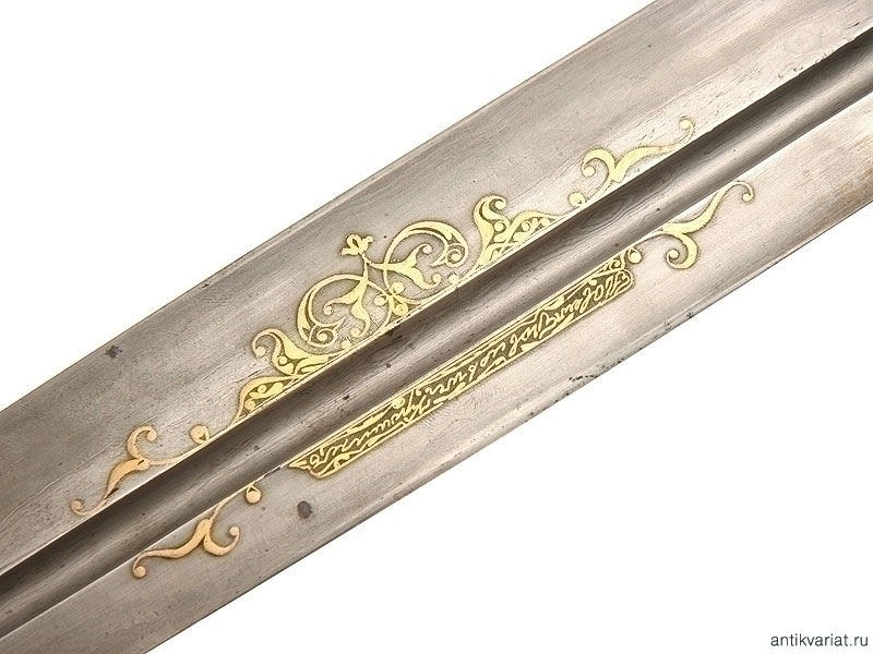 Кинжал кавказский, Тифлис, первая четверть 19 века. Клинок кинжала богато украшен золотой насечкой по правой стороне и имеет надпись, нанесенную золотом красивым подчерком: "Павел Павловичъ Крошинъ". Данная насечка характеризует очень высокий уровень мастерства ювелира. По клинку можно судить также и о высоком уровне мастерства клиночника. Он имеет по одному смещенному долу с каждой стороны. На клинке просматривается замечательный дамаск. Клинок имеет поврежение: в трех сантиметрах от кончика острия он надломлен (по краям в местах закала) и уверенно держится за счет центральной незакаленной части. Рукоять цельная из белой кости. Заклепки на рукояти и обоймица на ножнах выполнены золотой насечкой по металлу. Ножны обтянуты старым красным бархатом, выцвевшим на правой лицевой стороне. Верхняя обоймица и наконечник выполнены из серебра. Они богато украшены растительным орнаментом, а также изображениями животного мира. Клинок относится к категории редко встречающихся на современном антикварном рынке и представляет историческую и культурную ценность.