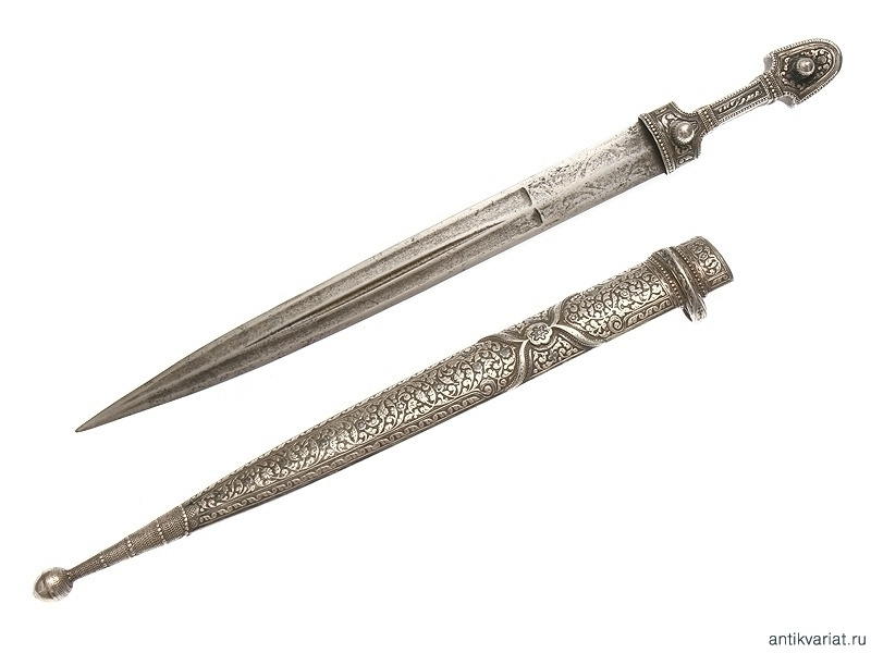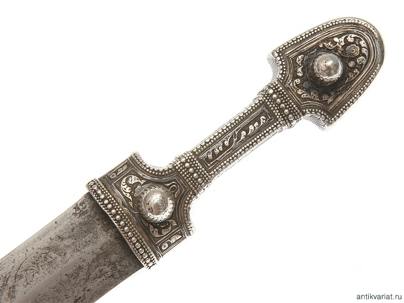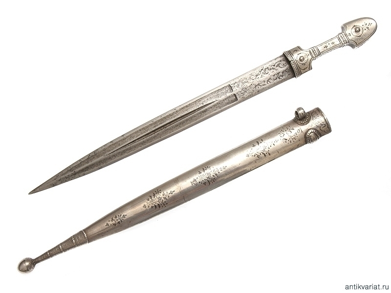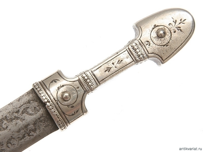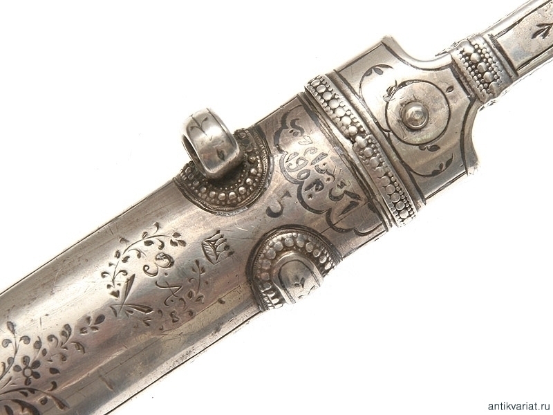 Кинжал кавказский цельносеребряный, рукоять и ножны выполнены дагестанским мастером в 1901 году. Клинок чеченский, работы атагинских мастеров. На пяте клинка от рукояти до дол с обеих сторон нанесен методом травления орнамент, характерный для атагинских мастеров. На обратной стороне ножен нанесены методом чернения дата - 1901 год, имена мастера и владельца, а также изображена корона Российской империи. Отдельно просматривается номер 5, нанесенный методом чернения, а также инициалы З.А., обрамленные венком. Чеченские клинки на антикварном рынке встречаются редко.