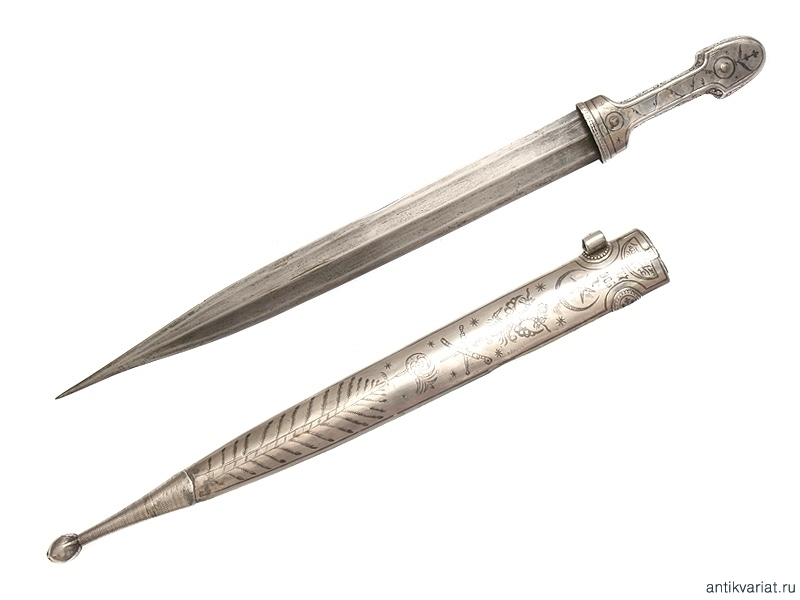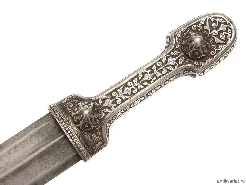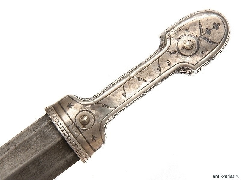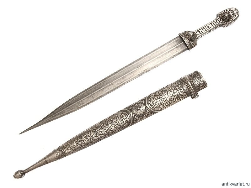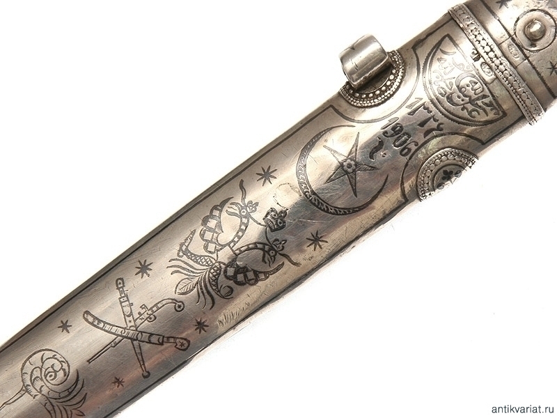 Кинжал кавказский цельносеребряный, работы дагестанского мастера серебярных дел, 1906 год. Клинок работы чеченских мастеров, имеет характерную для чеченских клинков аула Дарго и Джугурта рубяще-режущую заточку и противокольчужное колющее острие. На обратной стороне клинка имеется символика двуглавого орла, полумесяц со звездой и скрещенное оружие, а также надписи на арабском языке с именем мастера и владельца. Прибор кинжала выполнен очень искусным мастером серебряного дела. Состояние прибора и клинка хорошее. Чеченские клинки на антикварном рынке встречаются редко.