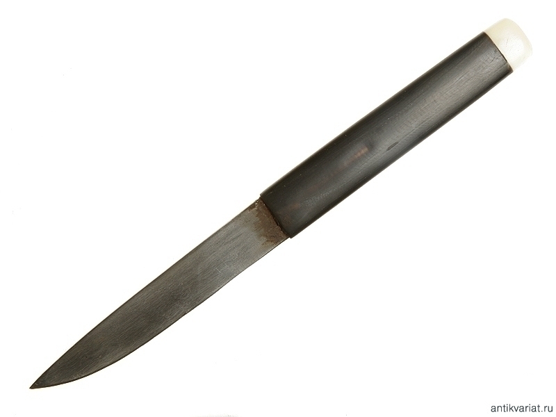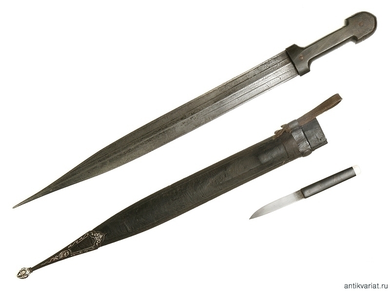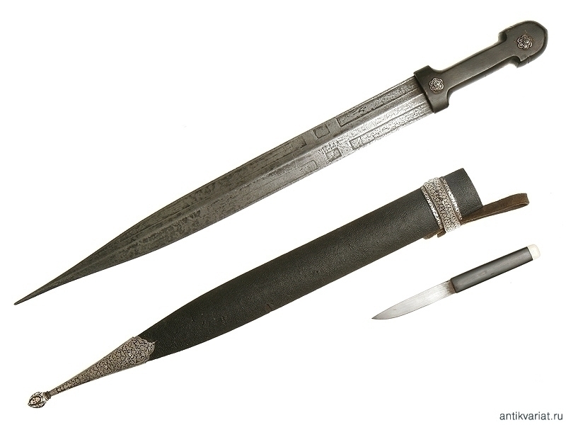 Кинжал кавказского типа общей длиной 58 см. Клинок с гравированным клеймом "Чилла". Рукоять из черного рога со стальными заклепками, украшенными серебряной насечкой. Металлический прибор ножен украшен в аналогичной технике. В ножнах имеется карман для дополнительного миниатюрного ножика. Конец XIX - начало ХХ века. Очень хорошее состояние.