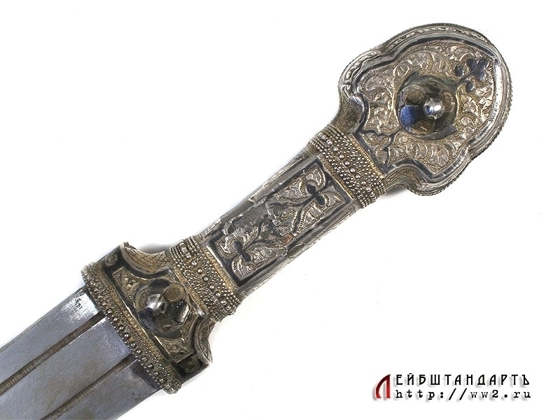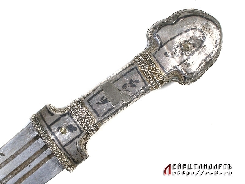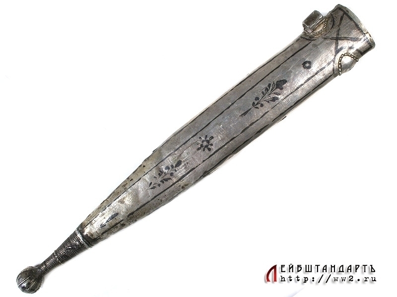 Ножны серебряные, также украшены гравировкой, чернью и позолотой. Ножны и рукоять подвергались ремонту, видны следы пайки.