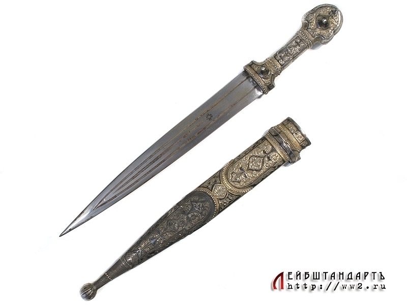 Кинжал кавказского типа в серебряной оправе. Общая длина кинжала - 42,8 см, длина без ножен - 40,3 см, длина клинка - 28 см. Клинок классический кинжального типа, с тремя узкими долами. Рукоять кованая серебряная, украшена гравировкой, чернью и позолотой, с двумя гранеными заклепками.