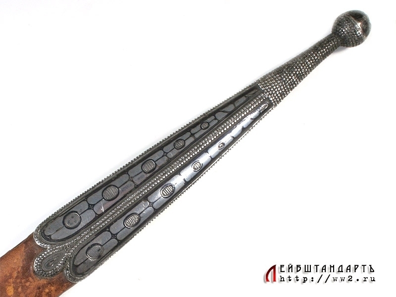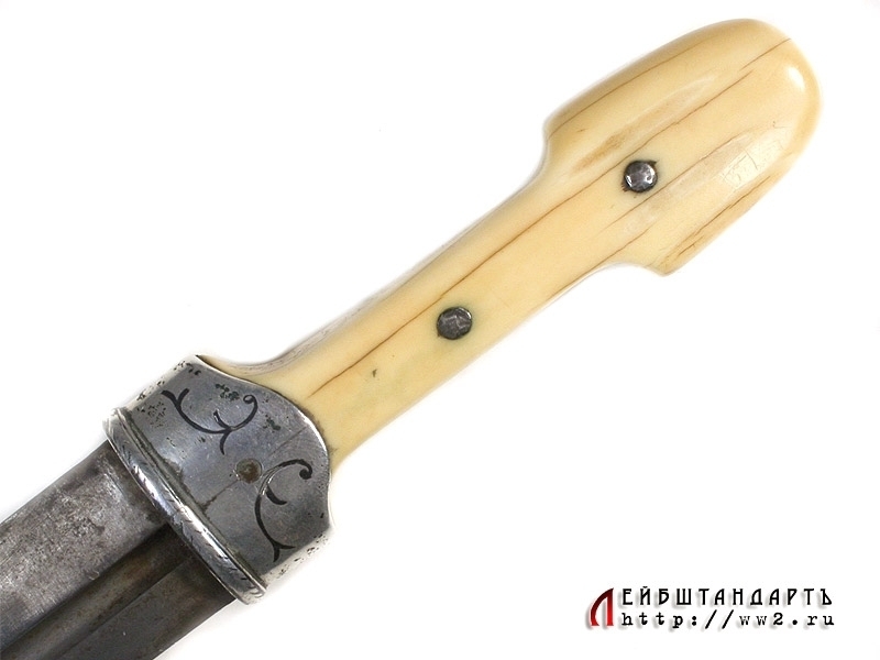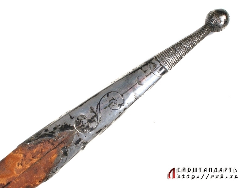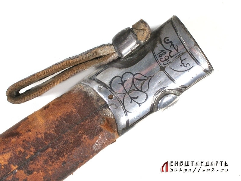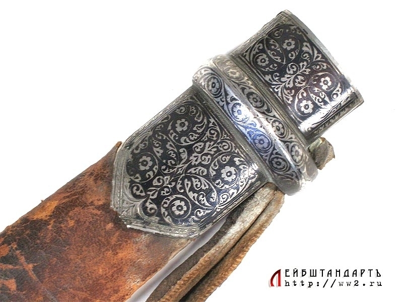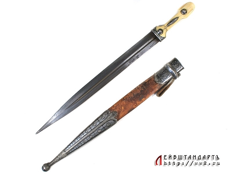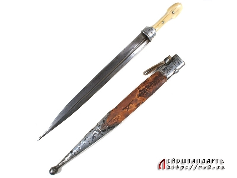 Кинжал кавказского типа общей длиной 53 см. в отличной сохранности. Массивный клинок с одним долом, без клейм. Рукоять с роговыми накладками, украшенная серебряными гранеными заклепками с нанесенным чернью узором. Ножны деревянные, обтянутые коричневой кожей. Устье и наконечник ножен также изготовлены из серебра и украшены черневым орнаментом. На устье ножен с оборотной стороны чернью нанесен год изготовления - 1899.