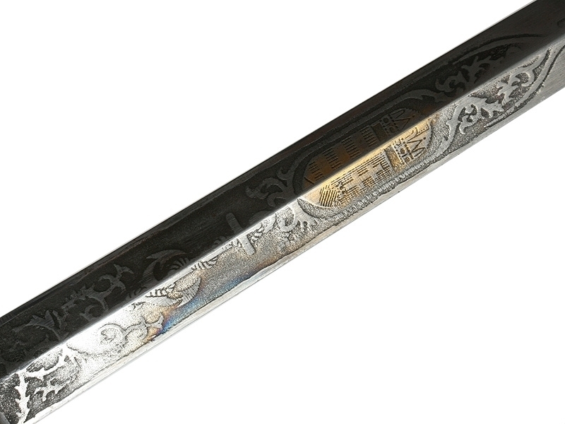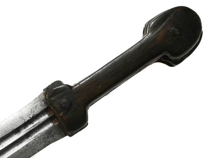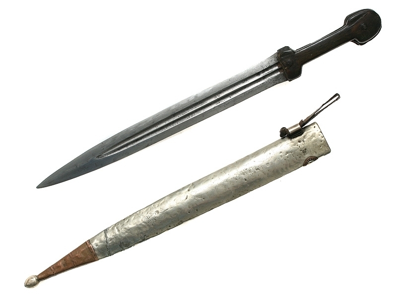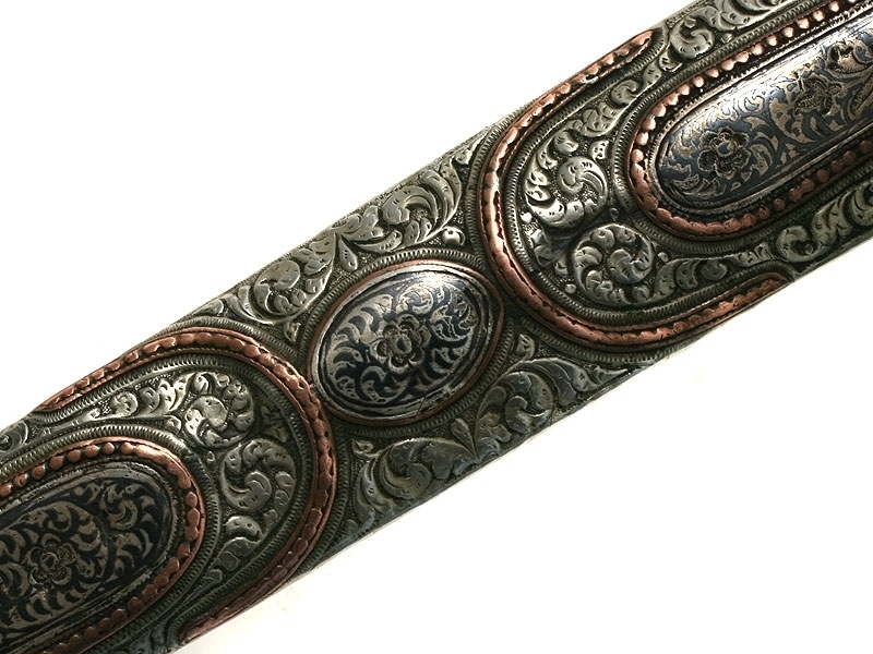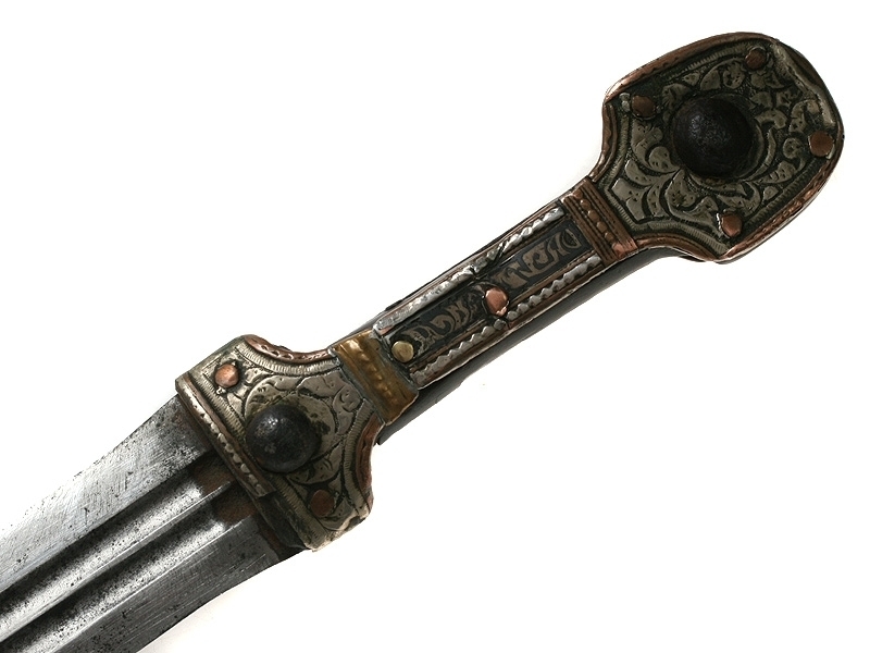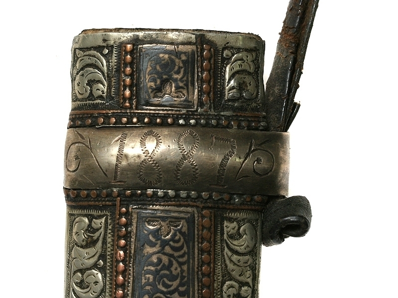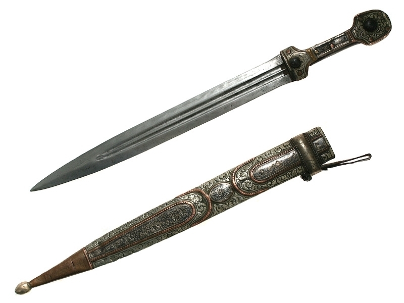 Кинжал Кубанского либо Терского казачьего войска в комбинированной оправе (белого металла с серебряными элементами). Массивный клинок с двумя узкими долами, без клейм. Рукоять роговая, с лицевой стороны закрыта орнаментированной пластиной белого металла с серебряной вставкой, украшенной черневым орнаментом. Заклепки со сферическими железными шляпками. Ножны также из белого металла, украшены гравировкой, с впаянными серебряными медальонами и медными чеканными поясками. Выгравирована дата изготовления: 1887 год.