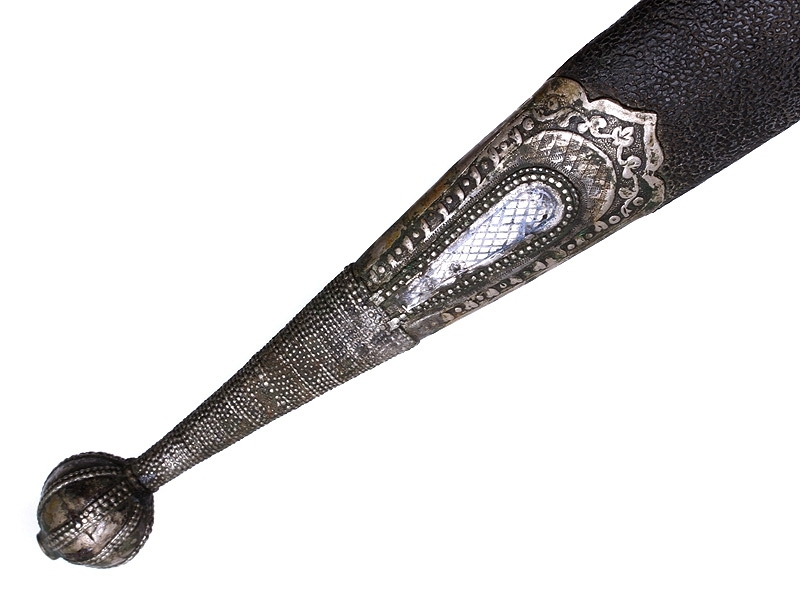 Кинжал казачий кавказской работы конца XIX - начала ХХ века. Клинок с двумя узкими долами, с таушированным клеймом мастера "Жамал" у основания. Рукоять роговая, с серебряными накладками и заклепками. Ножны деревянные, обтянутые кожей, с серебряными устьем и наконечником, украшенными гравированным черневым орнаментом.