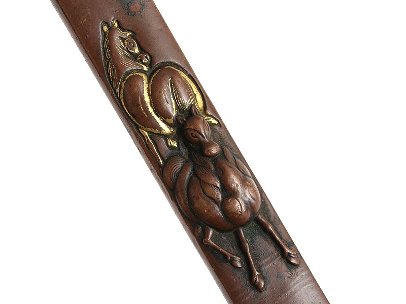 Кинжал хамидаси-танто работы мастера Тосимицу, конец XVIII века. Клинок с прямой линией закалки, заметна структура металла. Хвостовик подписан мастером "Тосимицу" и имеет три крепежных отверстия, одно из которых заклепано медной заглушкой. Рукоять деревянная, обтянутая кожей ската, с оплеткой узким тонким шнуром. Цуба, кодзука и все металлические элементы рукояти представляют собой единый комплект, кодзука украшена изображениями лошадей. Ножны покрыты черным матовым лаком. Элементы оправы изготовлены в первой половине XIX века.