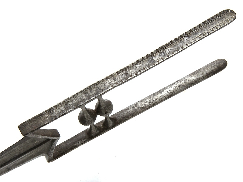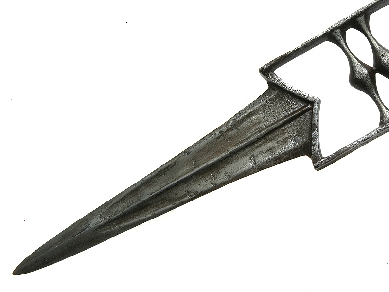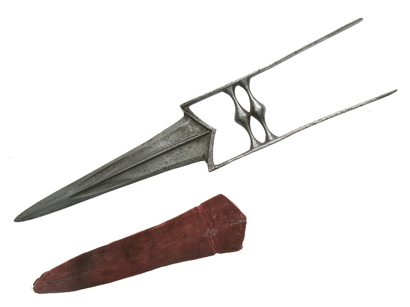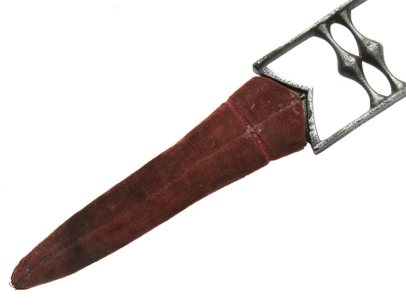 Традиционный индийский кинжал для левой руки "кутар". Рукоять с двумя поперечными планками для устойчивого удержания в руке, две длинные боковые плоскости защищают руку от рубящих ударов и позволяют их отбивать. Клинок массивный, с ярко выраженным центральным ребром, утолщающийся к концу. Ножны деревянные, оклеенные бархатом. XIX век. Состояние среднее, имеются поверхностные следы коррозии.