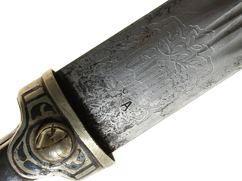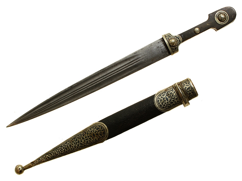 Кинжал Кубанского казачьего войска в оправе белого металла, в очень хорошей сохранности. Клинок с двумя узкими и двумя широкими долами. У основания клинка с одной стороны в орнаментальном картуше нанесена травлением монограмма "ЗОФ" (Златоустовская оружейная фабрика) с годом выпуска - 1911; с оборотной стороны в аналогичном картуше - монограмма "ККВ" (Кубанское казачье войско). Рукоять роговая, муфта и заклепки украшены черневым орнаментом. Ножны деревянные, обтянуты кожей, с металлическим прибором, также украшенным черневым орнаментом. Необходимо отметить, что орнамент прибора ножен являлся уставным для Кубанского и Терского казачьего войска. Очень хорошее состояние.