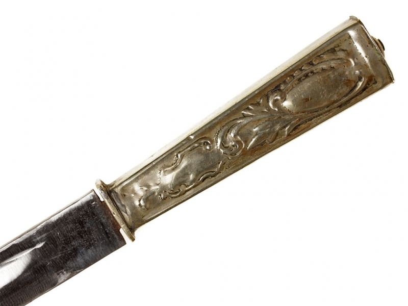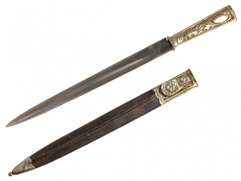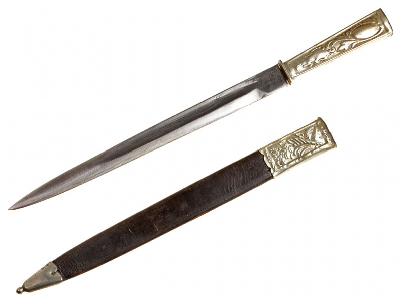 Форменный кинжал офицеров иррегулярных дружин, изготовленный в середине - второй половине XIX века. Клинок однолезвийный, со слабо выраженным широким долом, без клейм. Рукоять металлическая, изготовлена из мельхиора, украшена тисненым орнаментом. Ножны из темно-коричневой кожи, с мельхиоровым устьем и наконечником.