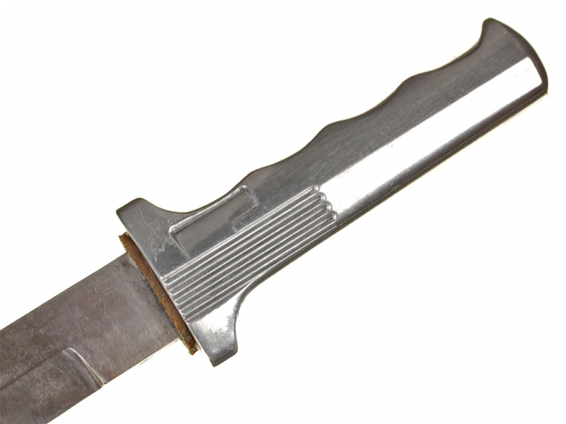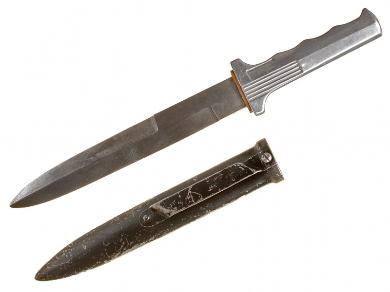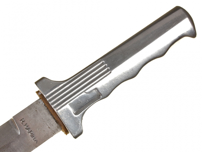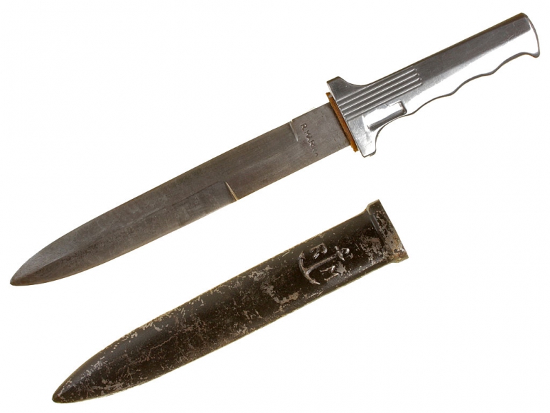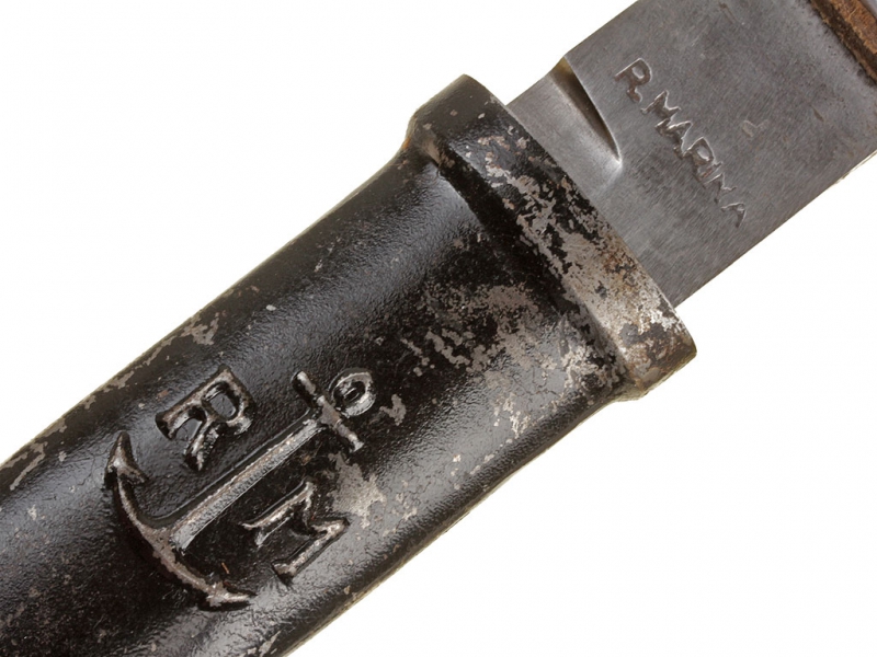 Нож рядового, унтер-офицерского и офицерского состава штурмовых групп флота образца 1936 года. Клинок с клеймом "R.Marina", рукоять целиком изготовлена из алюминия, ножны металлические, выкрашенные в черный цвет, украшенные рельефным изображением якоря и букв "RM" (Regia Marina).