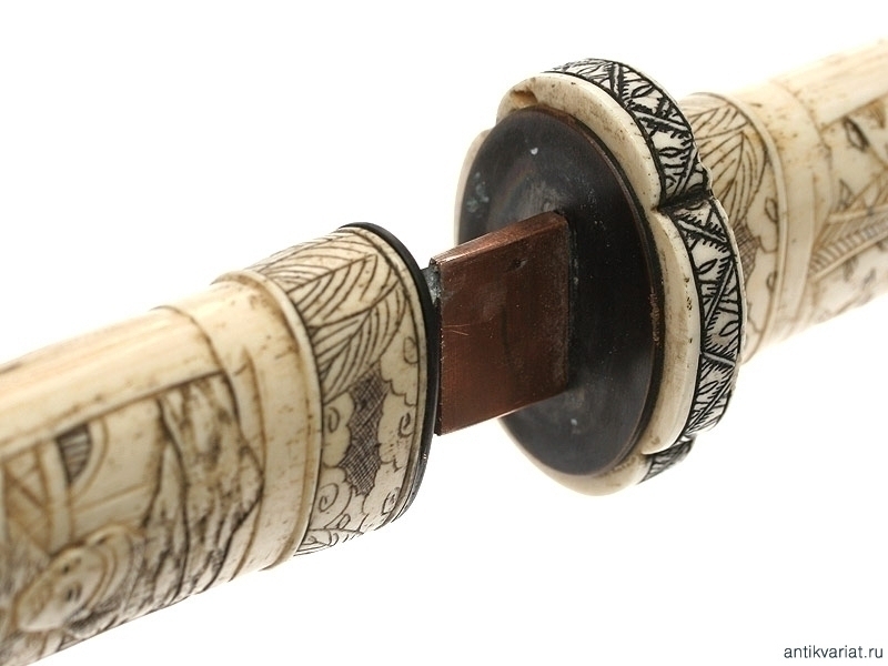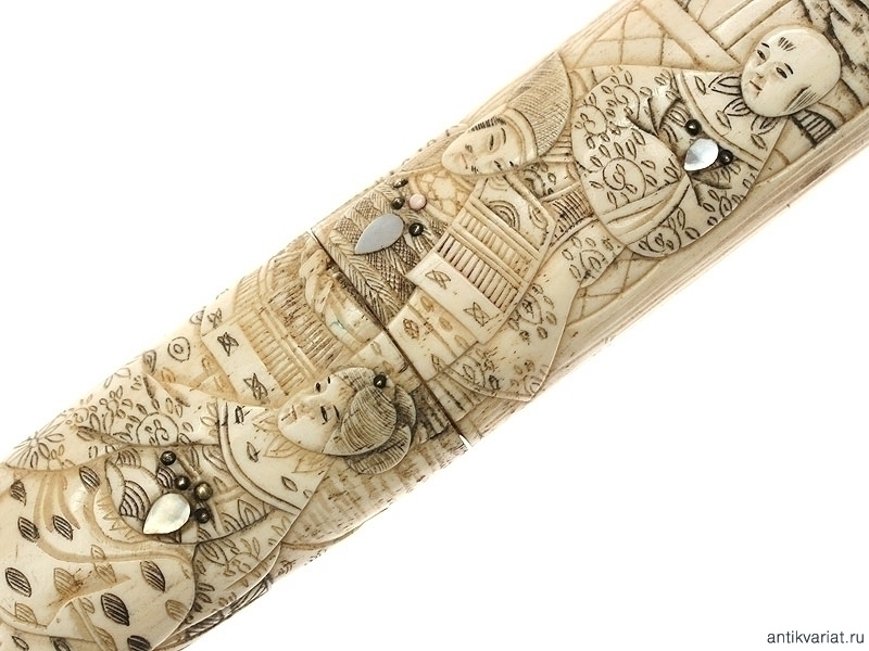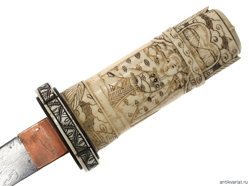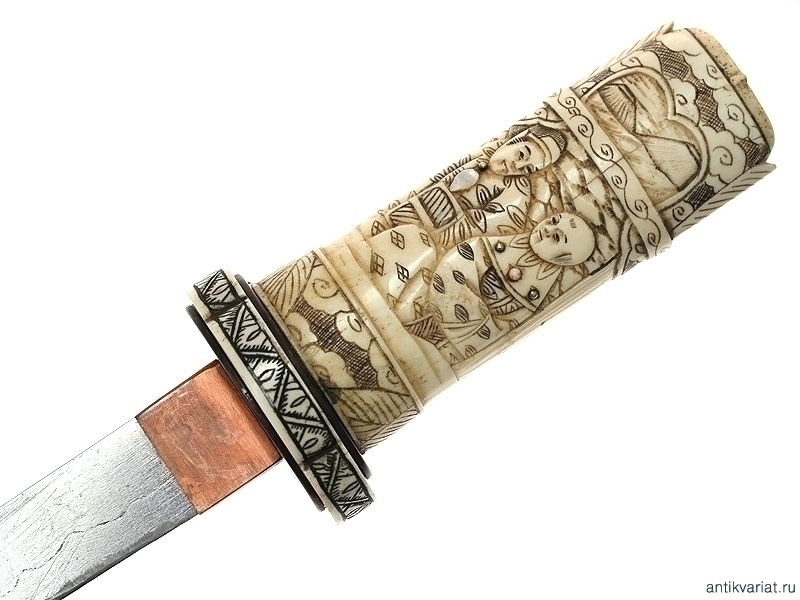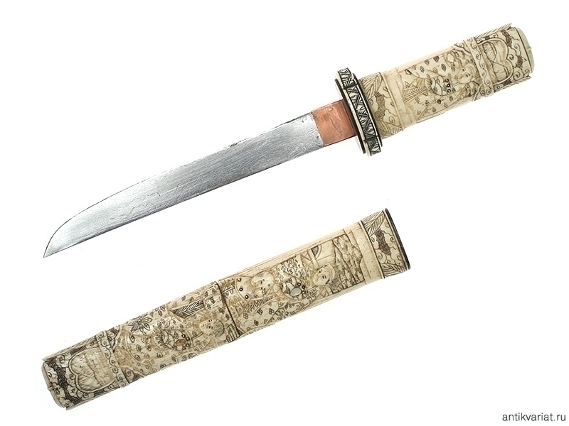 Традиционный японский кинжал танто, изготовленный в начале периода Мейдзи (вторая половина XIX века). Клинок классической формы, без долов. Рукоять и ножны изготовлены из слоновой кости и украшены резными жанровыми сценками. В незначительной мере присутствует инкрустация перламутровыми лепестками и латунными гвоздиками с круглыми шляпками. Цуба также изготовлена из слоновой кости, с овальными медными шайбами сэппа.
