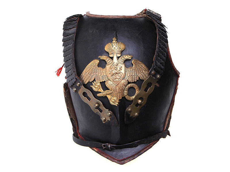 Кираса офицера Лейб-Гвардии Кирасирского полка, изготовленная в 1830-е годы. Основа кирасы - из тонкой жести, край имеет круглую завальцовку для придания прочности конструкции. Имеет классическое для кирасы устройство, состоящее из двух половин, закрывающих грудь и спину. Нагрудная часть имеет вертикальное выступающее ребро. Поверхность кирасы - черная лакированная. На груди помещено изготовленное из золоченой латуни изображение двуглавого орла (как на кивере гвардейской пехоты), положенное офицерам Лейб-Гвардии Кирасирского полка по Приказу от 27 февраля 1833 года. Под орлом, по обеим сторонам от центрального ребра, помещены два латунных шпенька для фиксации плечевых ремней. Край нагрудной части имеет ободок из коричневой кожи, поверх которого пущен витой красный шнур. Изнутри нагрудная часть имеет простеганную ватную подкладку.