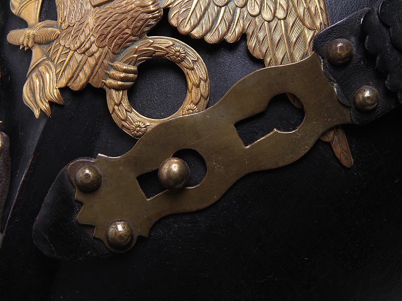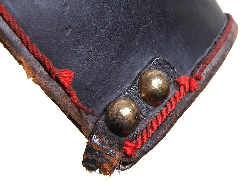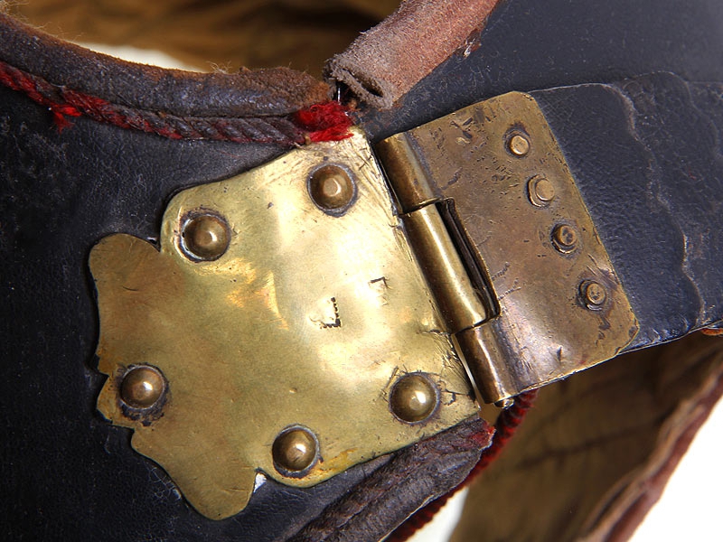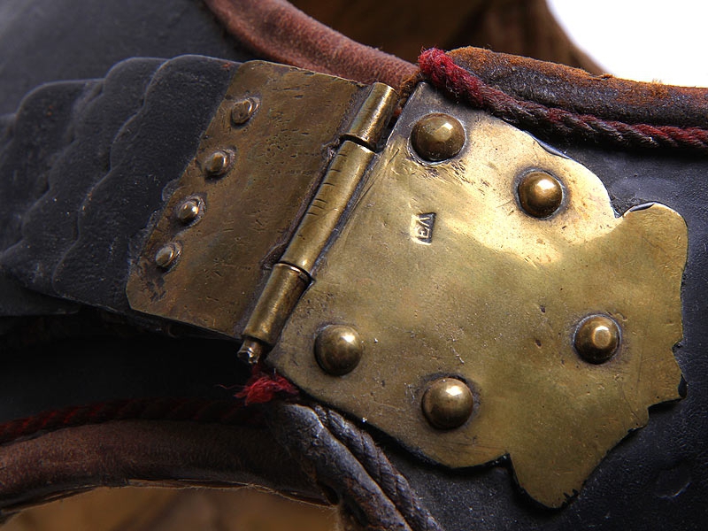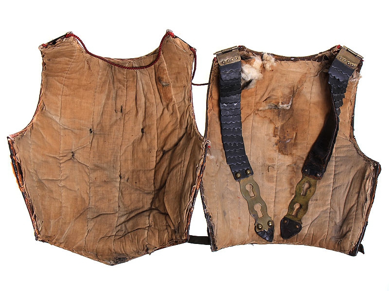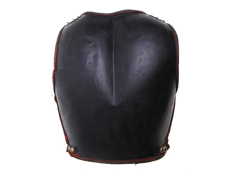 Закрывающая спину половина кирасы - также черная лакированная. Имеет кожаные плечевые ремни, покрытые наборной четырех/пяти-фестонной чешуей. Чешуя также имеет черное лаковое покрытие, за исключением застежек, изготовленных из золоченой латуни. На уровне пояса латунной золоченой заклепкой укреплен стягивающий кожаный ремешок, оборванный с одной стороны. Изнутри - стеганый ватный подбой, как и у нагрудной части.