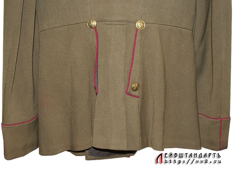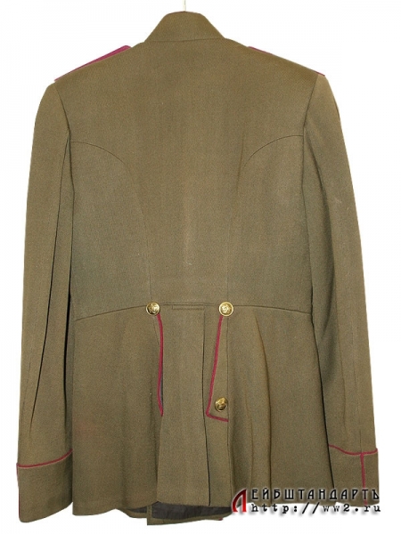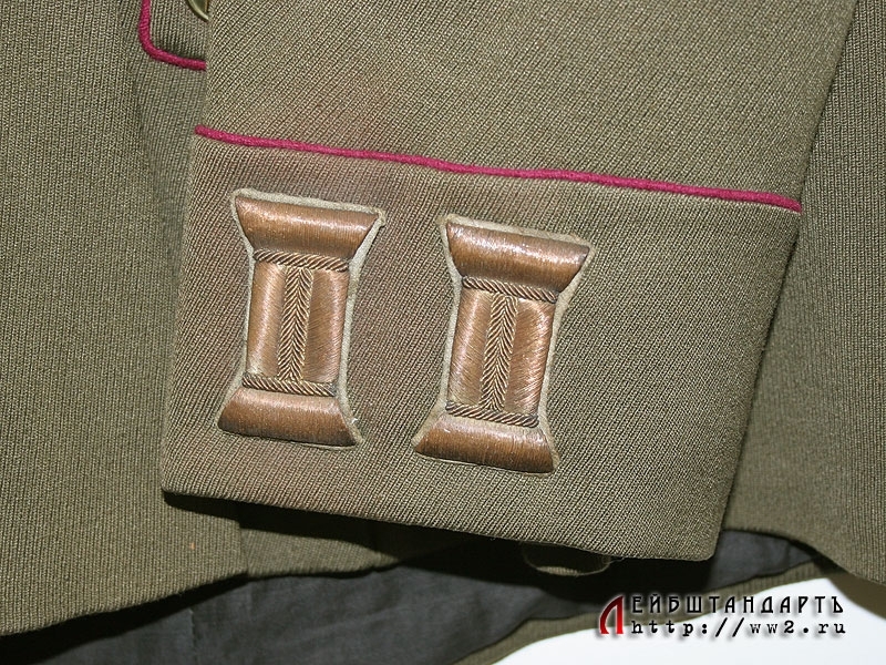 Китель полковника пехоты образца 1943 года в отличном состоянии. Сшит из диагоналевого сукна, малиновый кант и петлицы. Латунные пуговицы раннего выпуска. Погоны золотые, с малиновыми просветами и общевойсковыми петлицами. На груди - следы отверстий от наград. Размер примерно 48. На рукавах оригинально пришито по две катушки. Подкладка черного цвета.