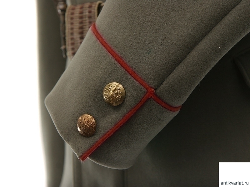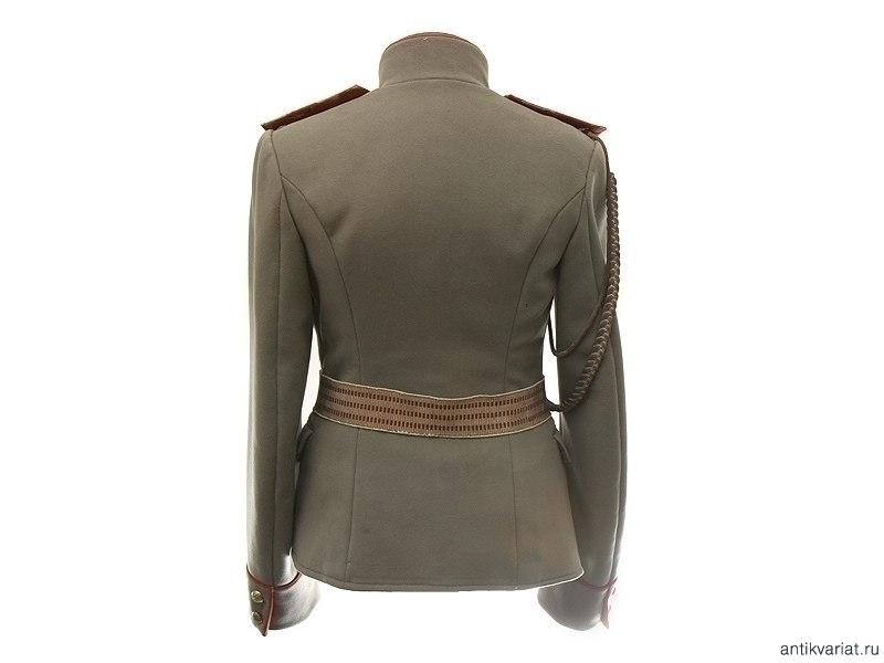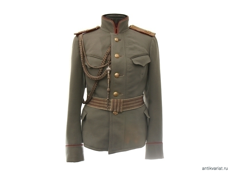 Китель защитного цвета прапорщика 185 пехотного полка с погонами, поясом и аксельбантом. На левом нагрудном кармане - обметанное отверстие под полковой знак либо жетон об окончании школы прапорщиков. По обшлагам и воротнику - красный кант. Малый размер. Очень хорошее состояние.