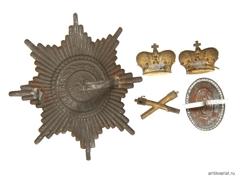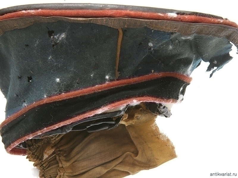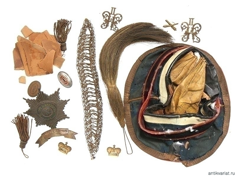 Кивер офицерский лейб-гвардии 3й артиллерийской бригады, использовавшийся в начале 20 века в фотоателье, имеет многочисленные следы добавлений и переделок. Верх из черной лаковой кожи, тулья из черного сукна с голубым околышем, по краю которого вшит красный кант. Андреевская звезда для нижних чинов из железа с остатками красочного покрытия, наградная лента "За Телиш 16 октября 1877 года". Сохранилась кокарда и прочие металлические части, а также султан из конского волоса. В комплект входит также несколько предметов фурнитуры в качестве бонуса.