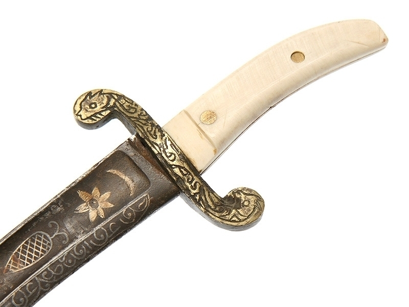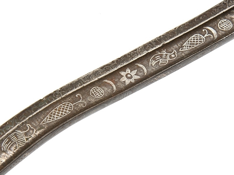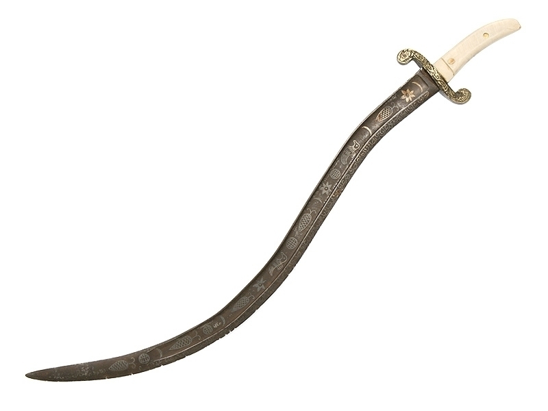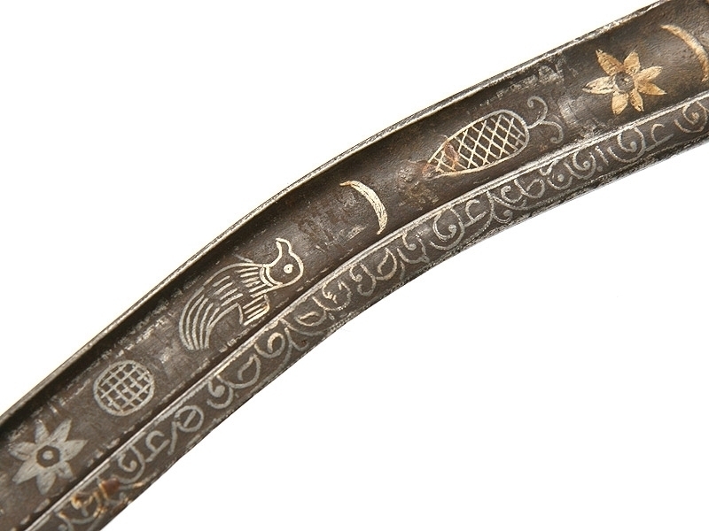 Кривая сабля - кхопеш, представляющая собой подвид ятагана (в отличие от него, с наружной заточкой клинка). Клинок украшен таушированными серебром и бронзой изображениями птиц и цветов, а также идущей близ кромки лезвия арабской надписью. Гарда бронзовая, украшена гравировкой. Рукоять реставрирована в середине ХХ века.