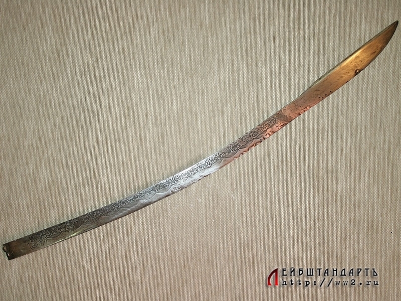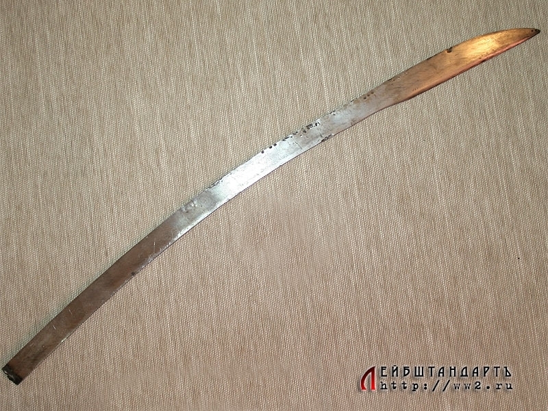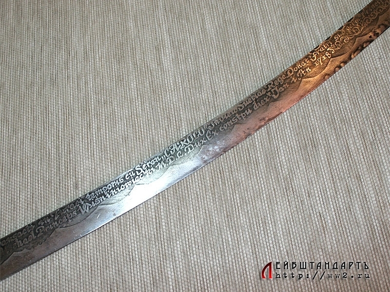 Клинок сабли типа "карабела" с травленой надписью на лицевой стороне. Общая длина клинка - 74,5 см, хвостовик обломан (имеются следы сварки - его явно пытались восстановить), незначительной кривизны, с елманью (расширением на конце с дополнительной режущей кромкой). Надпись длинная строчная, на латыни, из нее следует, что данный предмет представляет собой королевский подарок князю Великого княжества Литовского Михаилу Вишневецкому в память заключения мирного договора с турками в 1713 году. Слева от надписи у основания клинка размещен княжеский герб.