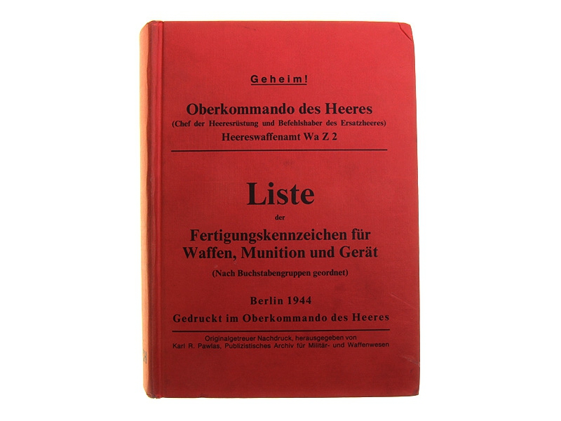 Репринтное издание редчайшего справочника кодов производителей оружия, военного снаряжения и амуниции Третьего рейха. Книга издавалась в Берлине в 1944 году под грифом "Секретно". Переиздание 1991 года, на немецком языке.