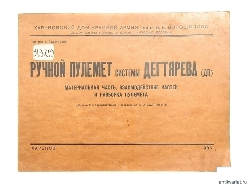 Книга "Ручной пулемет системы Дегтярева: материальная часть, взаимодействие частей и разборка пулемета", изданная Харьковским домом Красной Армии имени К.Е.Ворошилова в 1935 году. 31 стр. Формат 35 х 26 см.