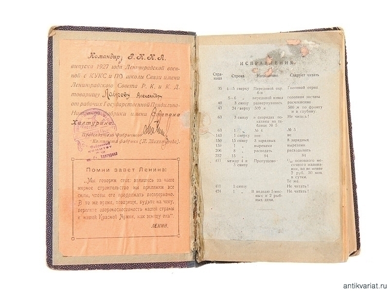 Книга была принесена в дар "Командиру РККА выпуска 1927 года Ленинградской военной с КУКС и ПО школы Связи имени Ленинградского Совета Р.К. и К.Д. товарищу Лаврову Александру от рабочих Государственной прядильно-нитяной фабрики имени Степана Халтурина".