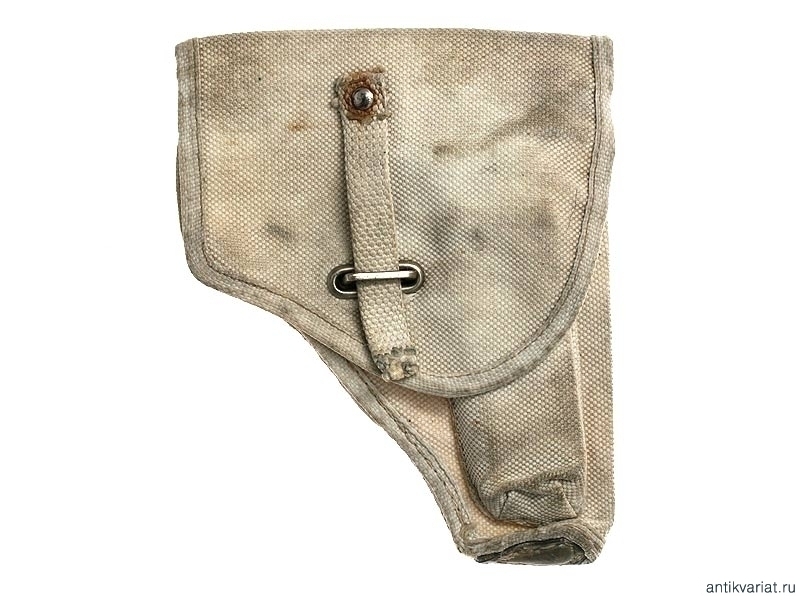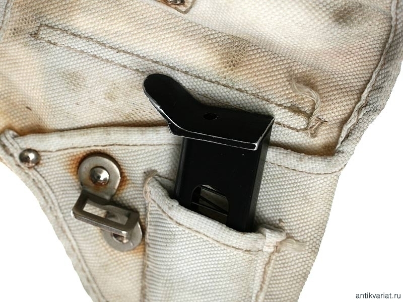 Кобура из белого брезента для итальянского пистолета Беретта образца 1934 года. Без клейм, послевоенного выпуска. В дополнительном кармашке - запасная обойма для патронов калибром 7,65 мм. Очень хорошее состояние.