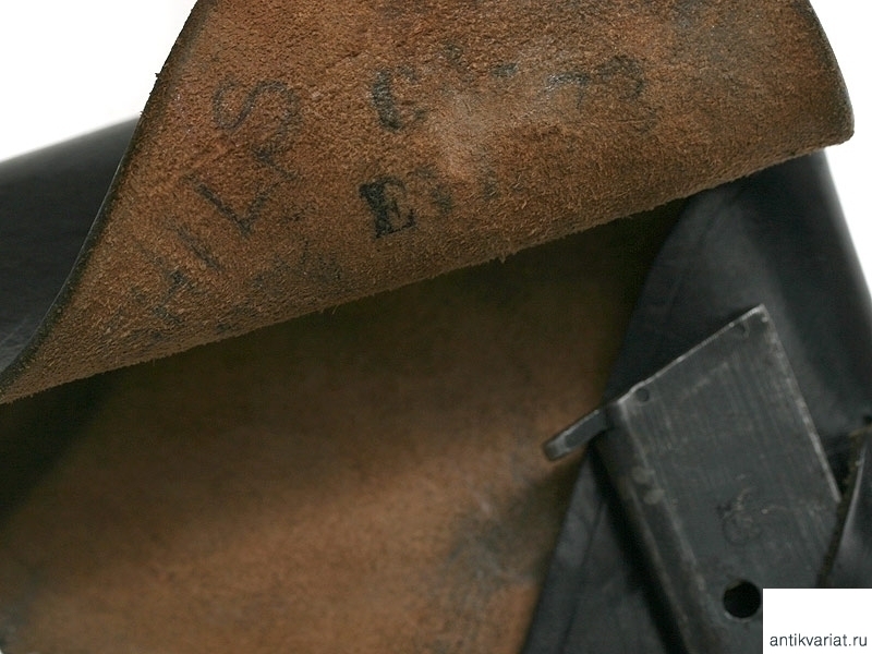 Кобура из черной кожи для бельгийского пистолета Браунинг образца 1922 года. Под крышкой - плохо читаемое чернильное клеймо изготовителя. В дополнительном кармашке - запасная обойма для патронов калибром 7,65 мм. Очень хорошее состояние.