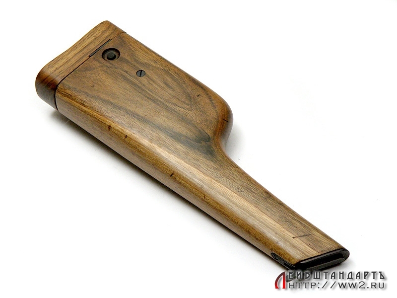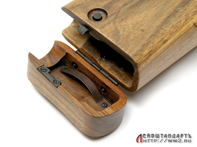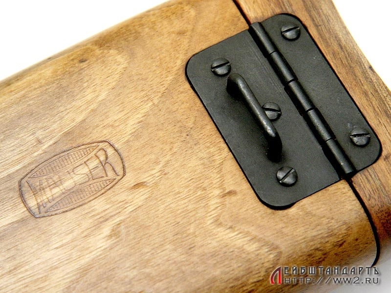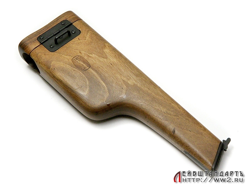 Приставная деревянная кобура-приклад для пистолета Mauser C96 в очень хорошем состоянии. Откидная крышка снабжена пружиной и фиксирующей кнопкой, на боковой поверхности выдавлено клеймо фирмы Mauser. Защелка в исправном состоянии, она позволяет превратить кобуру в съемный приклад. Лаковое покрытие частично сохранилось, имеются незначительные потертости.