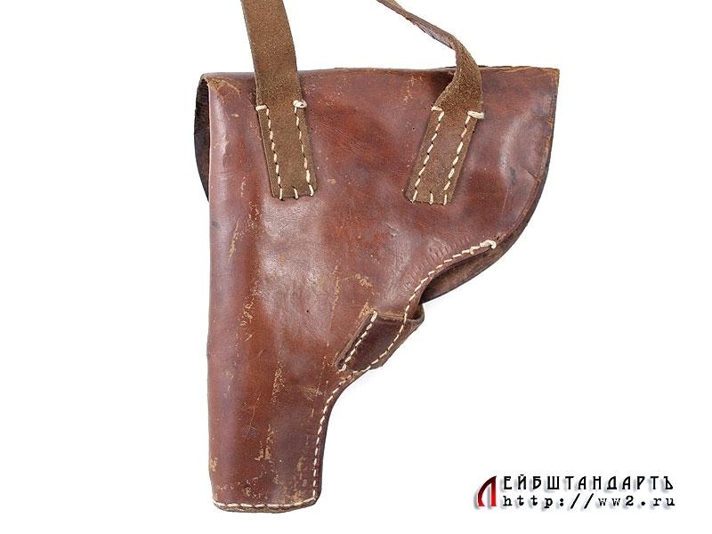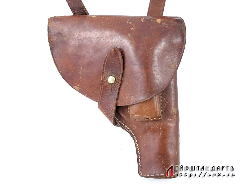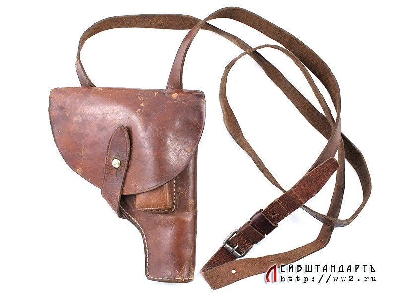 Кожаная кобура для пистолета "Браунинг", состоявшего на вооружении комсостава РККА до Второй мировой войны (после ее завершения он остался только в качестве наградного оружия). Укомплектована оригинальным кожаным ремнем, для ношения через плечо: такой ремень также предполагал возможность скрытого ношения оружия под верхней одеждой. Предмет в отличном состоянии.