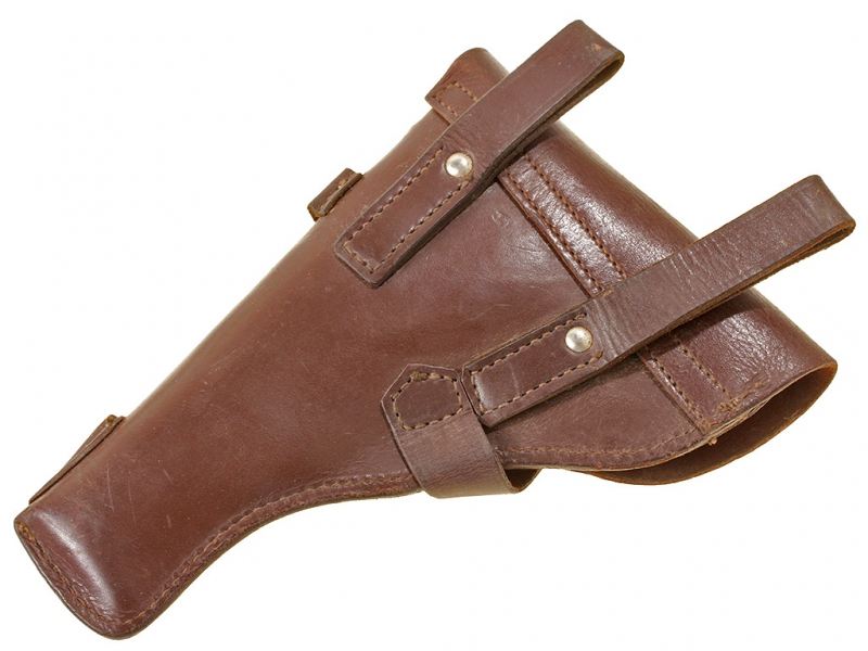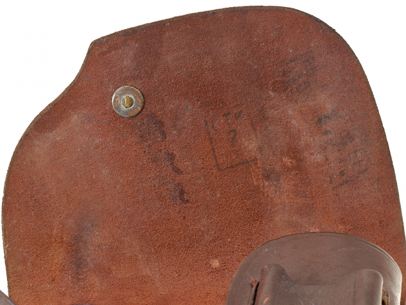 Кожаная кобура к пистолету системы Токарева образца 1933 года (ТТ). Послевоенного выпуска, под крышкой на внутренней стороне имеются клейма фабрики кожаных изделий. Кожа в хорошем состоянии, незначительные следы ношения.