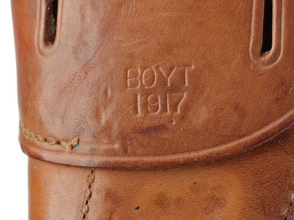 Оригинальная кобура к пистолету Кольт образца 1911 года - штатному пистолету американской армии. Стандартный армейский вариант из плотной темно-коричневой кожи с латунной фурнитурой, в хорошей сохранности. На оборотной стороне - клеймо изготовителя "BOYT" с годом выпуска - 1917.