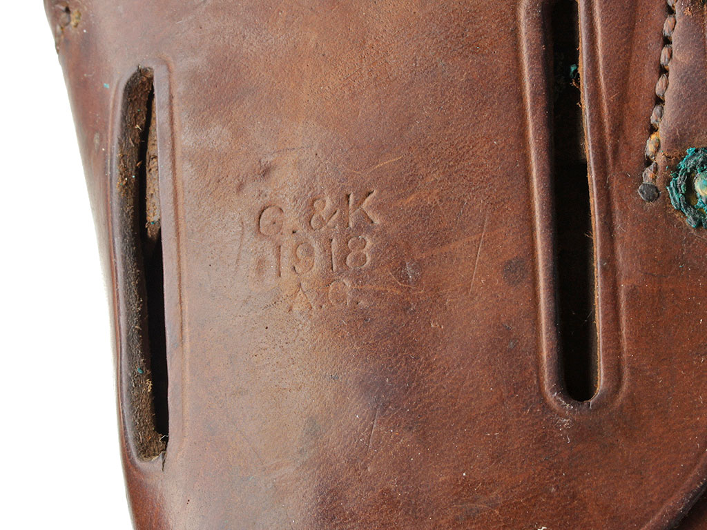 Оригинальная кобура к пистолету Кольт образца 1911 года - штатному пистолету американской армии. Стандартный армейский вариант из плотной темно-коричневой кожи с латунной фурнитурой, в хорошей сохранности. На оборотной стороне - клеймо изготовителя "G. & K." с годом выпуска - 1918.