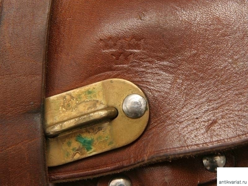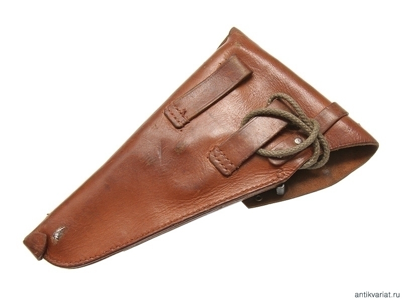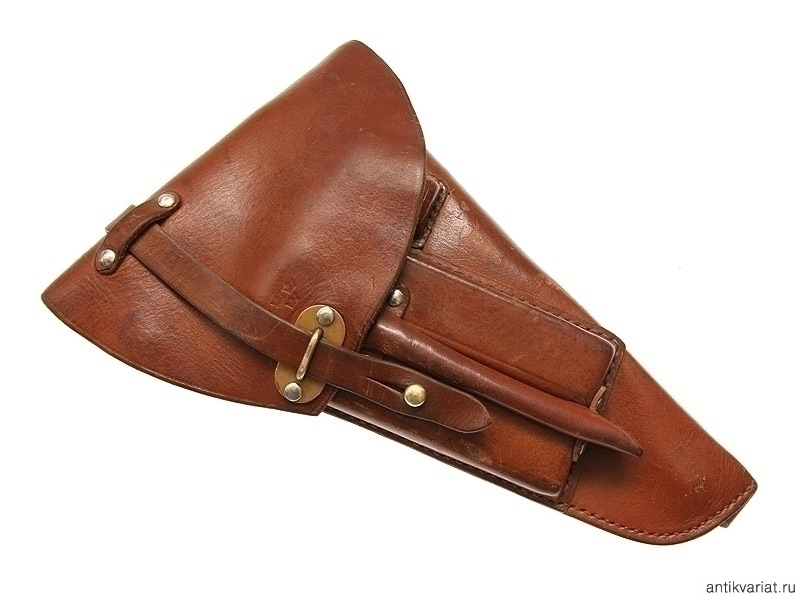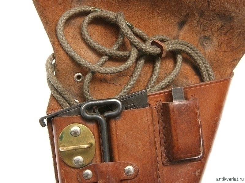 Кожаная кобура к пистолету "Гускварна" выпуска 1930-х - начала 1940-х годов. В комплект входят две запасные обоймы, шнур и шомпол. Очень хорошее состояние.