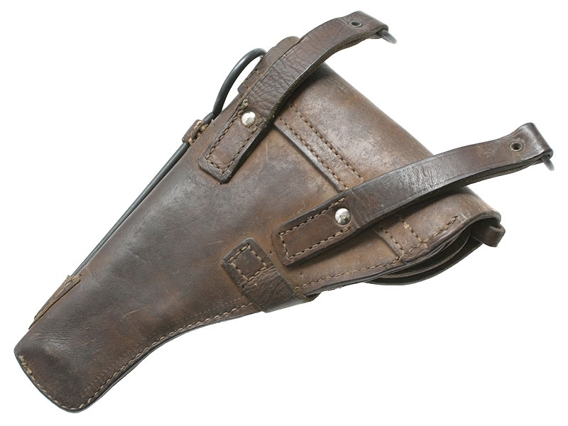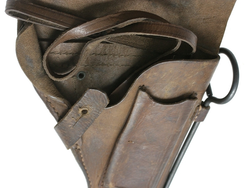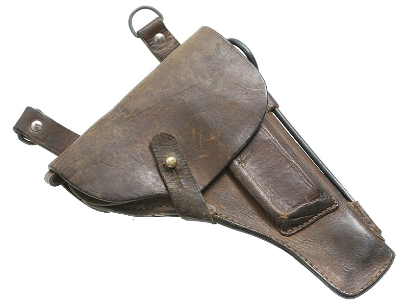 Ранняя кобура из темно-коричневой кожи к пистолету ТТ. Клеймо затерто, в комплект входят шомпол и ремешок.
