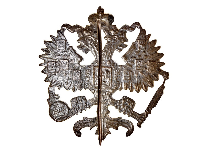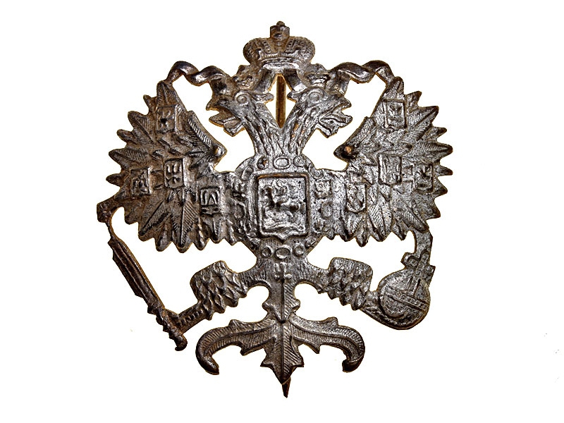 Оригинальная кокарда в виде Государственного герба - двуглавого орла. Латунь, серебрение, очень хорошее состояние. Начало ХХ века. Носилась нижними чинами кавалерии (имевшими белый прибор), жандармами.