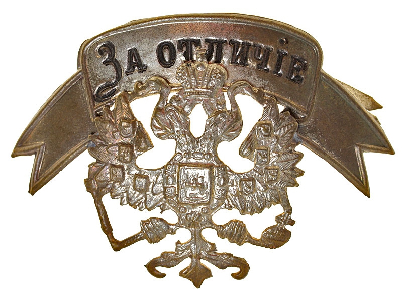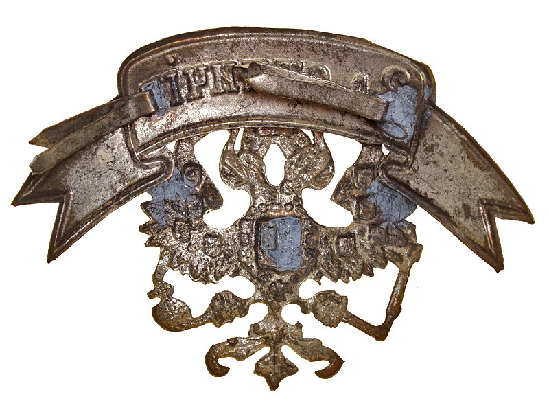 Оригинальная кокарда в виде Государственного герба - двуглавого орла. С лентой "За отличие". Латунь, серебрение, очень хорошее состояние. Начало ХХ века.