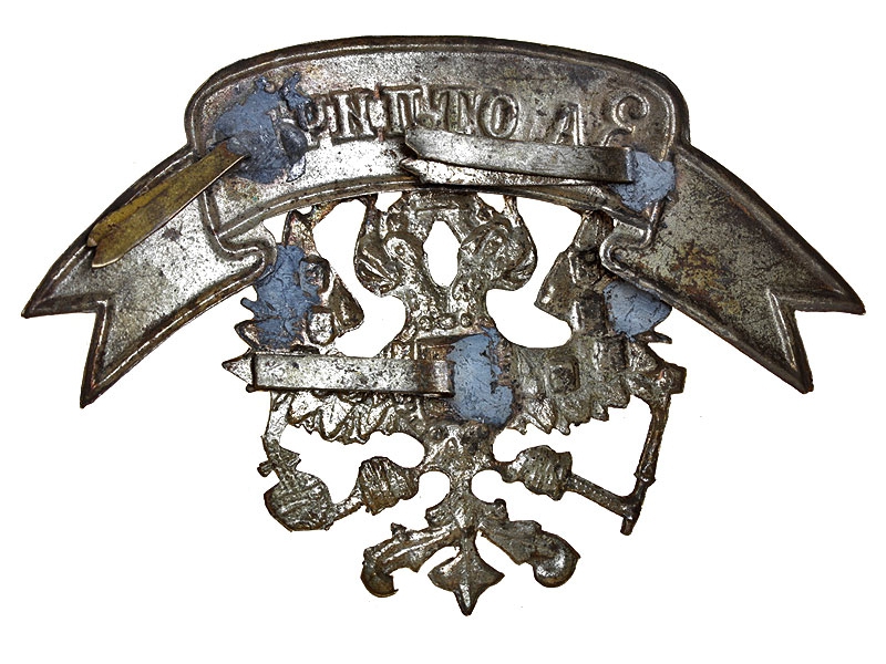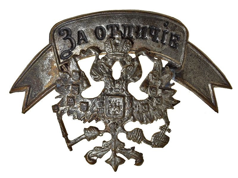 Оригинальная кокарда в виде Государственного герба - двуглавого орла. С лентой "За отличие". Латунь, серебрение, очень хорошее состояние. Начало ХХ века.