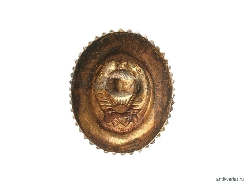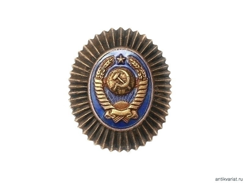 Кокарда работника Государственного банка СССР выпуска первой половины 1950-х годов. Посеребренный металл, горячая эмаль, герб СССР позолочен. Без клейм. Крепежные усы отсутствуют.
