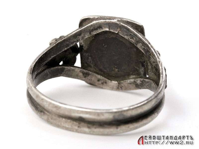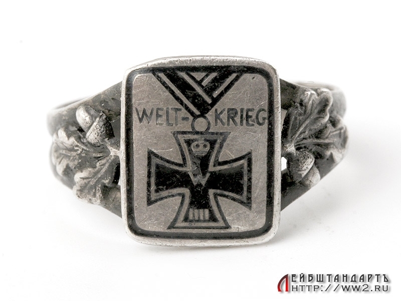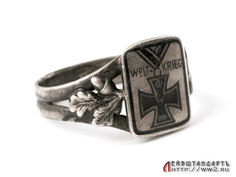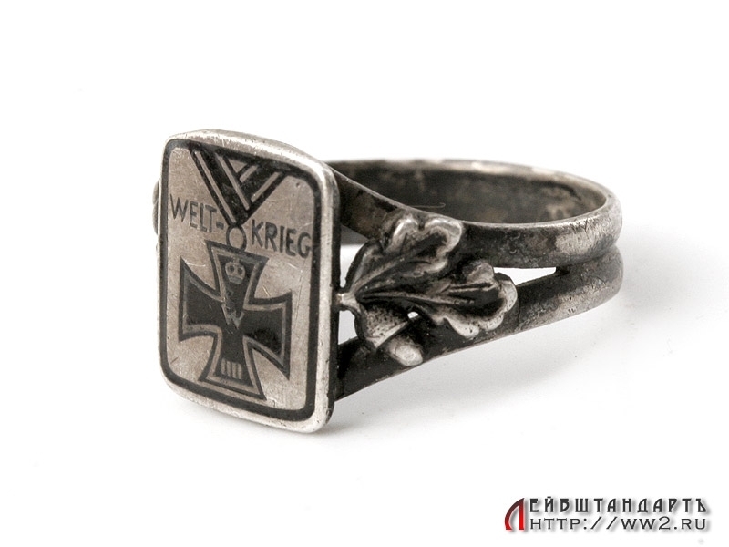 Красивое кольцо времен Первой мировой войны. Изготовлено из серебра 800 пробы. На щитке помещено залитое черной эмалью изображение Железного креста на ленте. По бокам от креста помещена надпись "Welt - Krieg" (Мировая война). Размер примерно 18 - 19. Предмет в отличной сохранности.