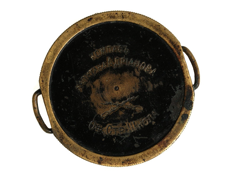 Офицерский армейский компас времен Первой мировой войны в хорошей сохранности. Корпус латунный, задняя крышка с надписью "Компасъ капитана Адрiанова", под которой помещено изображение скрещенных винтовок с аббревиатурой Офицерской стрелковой школы.