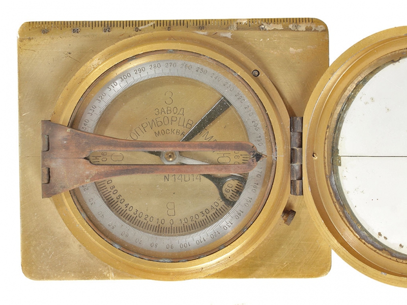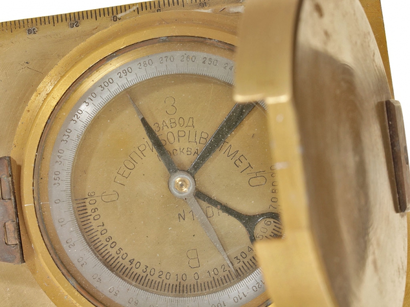 Компас в латунном корпусе, изготовленный в 1930-х годах заводом "Геоприборцветмет" в Москве. Применялся при полевых исследованиях.