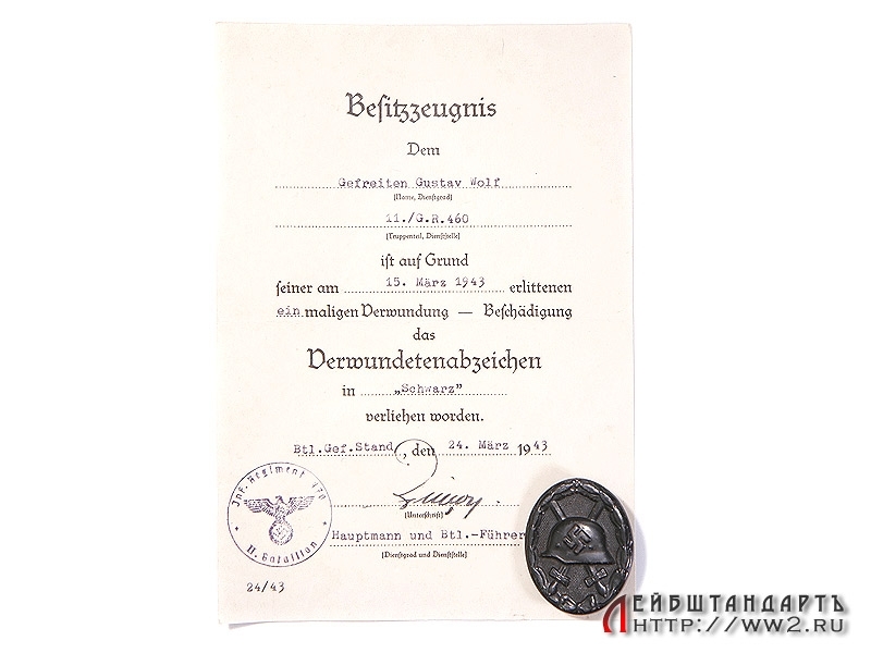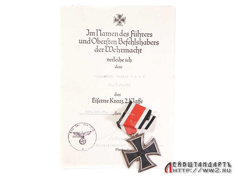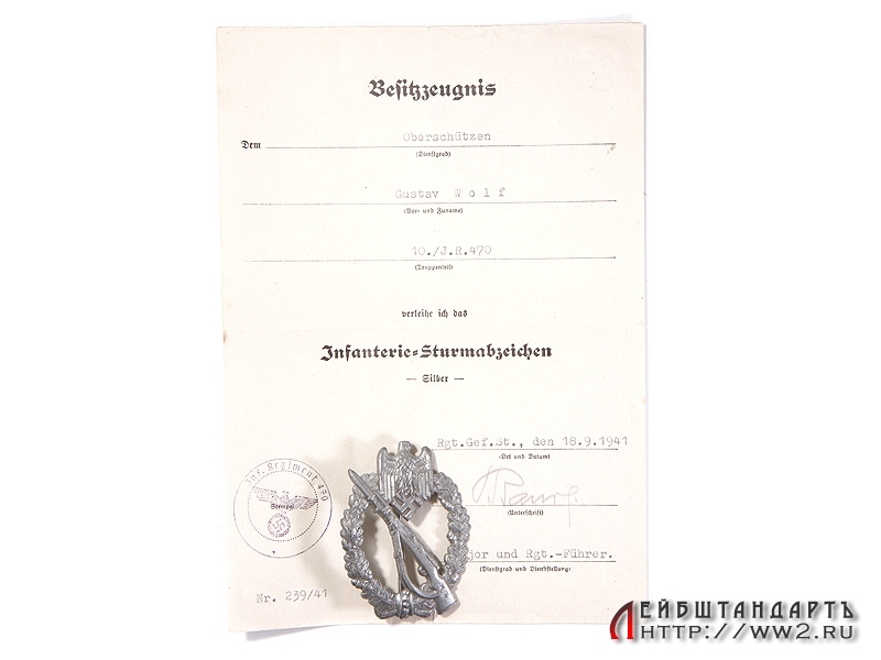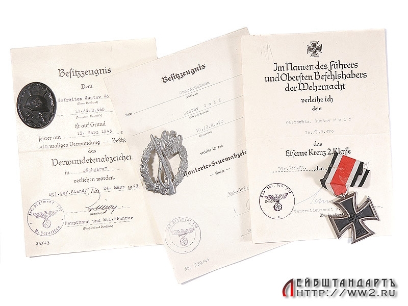 Комплект наград старшего стрелка - ефрейтора Вермахта Густава Вольфа с наградными документами. Комплект состоит из Железного креста 2 класса, пехотного штурмового знака и черного знака за легкое ранение. Классический наградной комплект немецкого солдата Второй мировой. Отличное состояние.