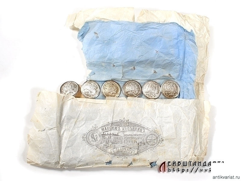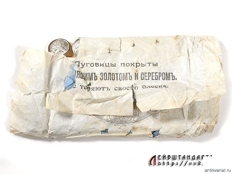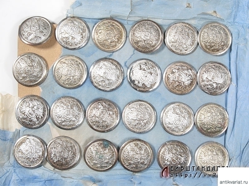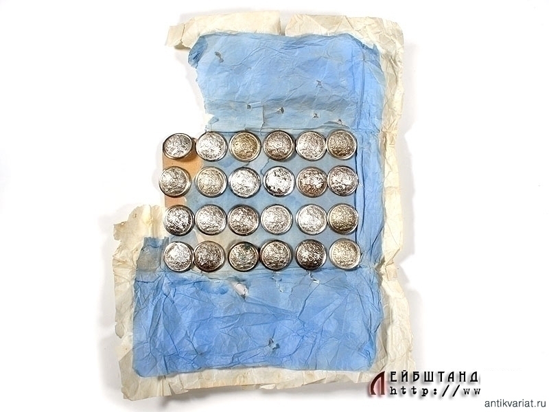 Комплект из 24 пуговиц для чиновничьего мундира в отличном состоянии. Пуговицы покрыты нетронутым слоем оригинального серебрения, на нагрудном щитке гербового двуглавого орла помещен герб княжества Финляндского. Пуговицы изготовлены известной петербургской фирмой Максима Копейкина и вложены в обертку из тонкой папиросной бумаги с рекламой фирмы и указанием: "Пуговицы покрыты настоящимъ золотомъ и серебромъ. Не теряютъ своего блеска".