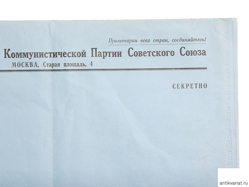 Большой конверт из синей бумаги, использовавшийся в главном аппарате ЦК КПСС. Помечен грифом "Секретно". 1950-е годы, СССР. Редкий предмет в отличной сохранности. Размер: 39,5 х 29,5 см